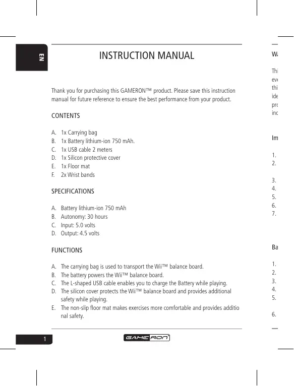 INSTRUCTION MANUAL Thank you for purchasing this GAMERONTN product. Please save this instruction manual for future reference to ensure the best performance from your product CONTENTS x Carming bag x Battery lithium-ion 750 mAh. 1x USB cable 2 meters x Slicon protective cover x Floor mat 2e Wrst bands nrpoez SPECIFICATIONS A. Battery lithium-ion 750 mah B. Autonomy: 30 hours €. Input: 5,0 volts D. Output: 4,5 vois FUNCTIONS he camying bag is used 10 transport the WT balance board he battery power the WT balance board he Lshaped USB cable enables you t charge the Battery while playing he slcon cover protects the Wii balance board and provides additional safety while playing E. The non-slip floor mat makes exercises more comfortble and provides additio ral sat. poez