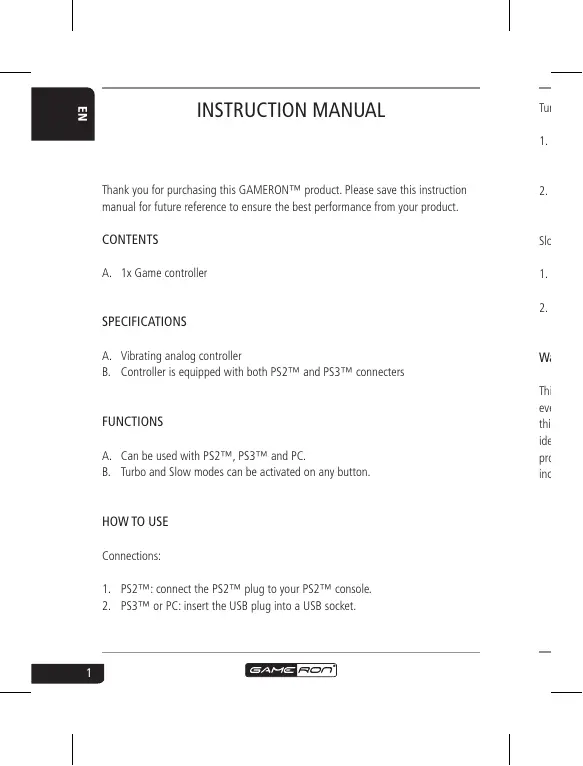 SPECIFICATIONS A. Vibrating analog controller B. Controller is equipped with both PS2™ and PS3™ connecters FUNCTIONS A. Can be used with PS2™, PS3™ and PC. B. Turbo and Slow modes can be activated on any button.