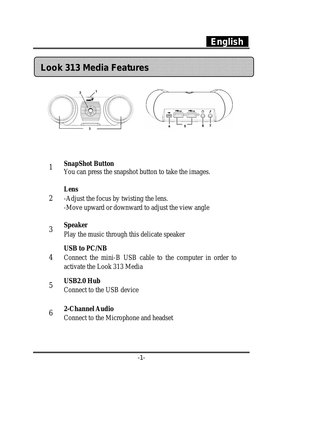 | Look 313 Media Features SnapShot Button You can press the snapshot button to take the images. Lens -A djust the focus by twisting the lens. -Move upward or downward to adjust the view angle Speaker Play the music through this delicate speaker USB to PC/NB Connect the mini-B USB cable to the computer in order to activate the Look 313 Media USB2.0 Hub Connect to the USB device 2-Channel Audio Connect to the Microphone and headset
