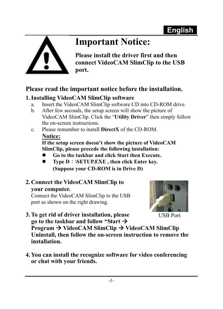 a. Insert the VideoCAM SlimClip software CD into CD-ROM drive. b. After few seconds, the setup screen will show the picture of VideoCAM SlimClip. Click the “Utility Driver” then simply follow the on-screen instructions. Please remember to install DirectX of the CD-ROM. Notice: If the setup screen doesn’t show the picture of Video CAM SlimClip, please precede the following installation: © Go to the taskbar and click Start then Execute. © Type D : \SETUP.EXE , then click Enter key. (Suppose your CD-ROM is in Drive D)