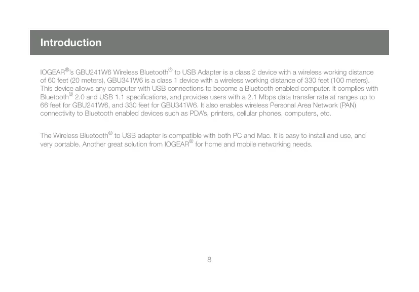 Thank you for purchasing one of the most feature-rich Bluetooth® to USB adapters available. IOGEAR's Bluetooth® to USB adapters are first-rate wireless connectivity accessories designed to help reduce the frustration of dealing with cable glut in your home or office. These adapters allow computers with USB connections to become Bluetooth enabled computers. They comply to Bluetooth® 2.0 and USB 1.1 specifications, and provide users with a 2.1Mbps data rate. They also enable wireless Personal Area Network (PAN) connectivity to Bluetooth enabled devices such as PDA's, printers, cellular phones, computers, etc.