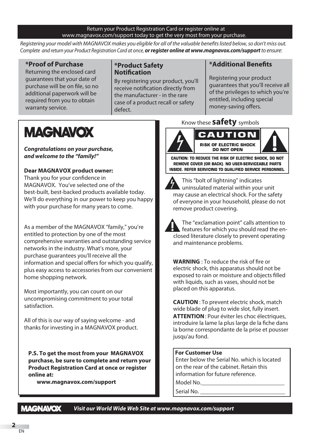 P.S. To get the most from your MAGNAVOX purchase, be sure to complete and return your Product Registration Card at once or register online at: