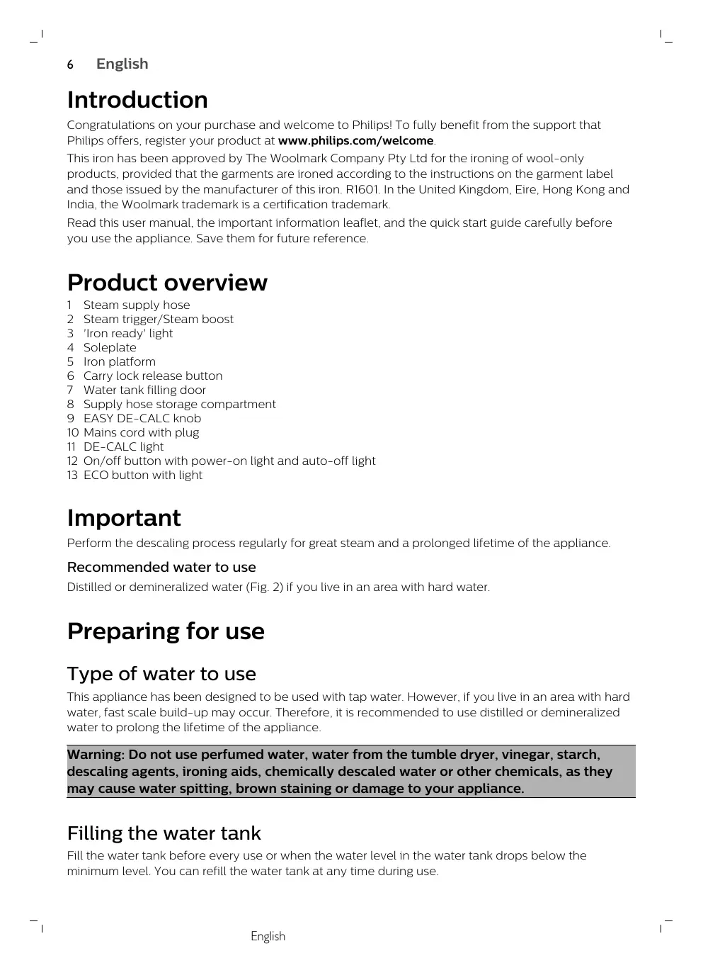 Introduction Congratulations on your purchase and welcome to Philips! To fully benefit from the support that Philips offers, register your product at www.philips.com/welcome. This iron has been approved by The Woolmark Company Pty Ltd for the ironing of wool-only products, provided that the garments are ironed according to the instructions on the garment label and those issued by the manufacturer of this iron. R1601. In the United Kingdom, Eire, Hong Kong and India, the Woolmark trademark is a certification trademark. Read this user manual, the important information leaflet, and the quick start guide carefully before you use the appliance. Save them for future reference.