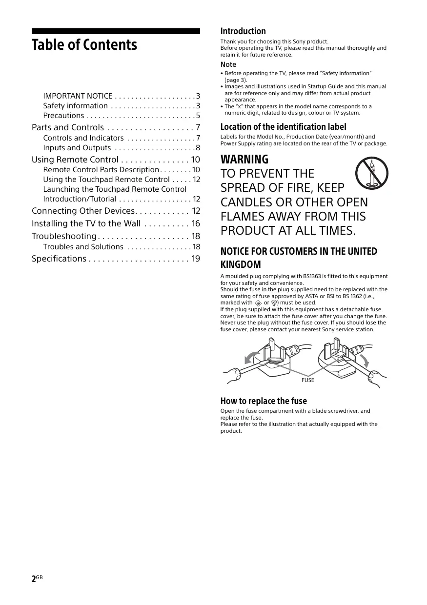 KINGDOM A moulded plug complying with BS1363 is fitted to this equipment for your safety and convenience. Should the fuse in the plug supplied need to be replaced with the same rating of fuse approved by ASTA or BSI to BS 1362 (i.e., or ) must be used. marked with If the plug supplied with this equipment has a detachable fuse cover, be sure to attach the fuse cover after you change the fuse. Never use the plug without the fuse cover. If you should lose the fuse cover, please contact your nearest Sony service station. FUSE How to replace the fuse Open the fuse compartment with a blade screwdriver, and replace the fuse. Please refer to the illustration that actually equipped with the product. 2GB Transporting IMPORTANT NOTICE This product has been manufactured by or on behalf of Sony Corporation, 1-7-1 Konan Minato-ku Tokyo, 108-0075 Japan. Inquiries related to product compliance based on European Union legislation shall be addressed to the authorized representative, Sony Deutschland GmbH, Hedelfinger Strasse 61, 70327 Stuttgart, Germany. For any service or guarantee matters, please refer to the addresses provided in the separate service or guarantee documents.