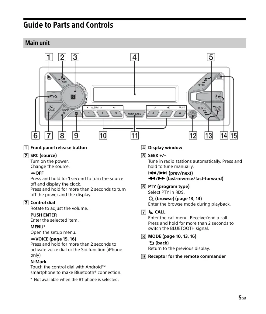 Guide to Parts and Controls Main unit Front panel release button Display window SRC (source) Turn on the power. Change the source. SEEK +/– Tune in radio stations automatically. Press and hold to tune manually. OFF Press and hold for 1 second to turn the source off and display the clock. Press and hold for more than 2 seconds to turn off the power and the display. Control dial Rotate to adjust the volume. PUSH ENTER Enter the selected item. MENU* Open the setup menu. VOICE (page 15, 16) Press and hold for more than 2 seconds to activate voice dial or the Siri function (iPhone only). / (prev/next) / (fast-reverse/fast-forward) PTY (program type) Select PTY in RDS. (browse) (page 13, 14) Enter the browse mode during playback.