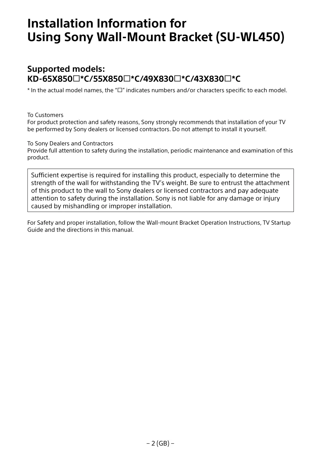 L’installation de ce produit exige un certain savoir-faire, notamment pour vérifier la résistance du mur qui devra soutenir le poids du téléviseur. Veillez à confier la fixation de ce produit au mur à des revendeurs ou installateurs agréés Sony et portez une attention suffisante aux consignes de sécurité pendant l’installation. Sony ne saurait
