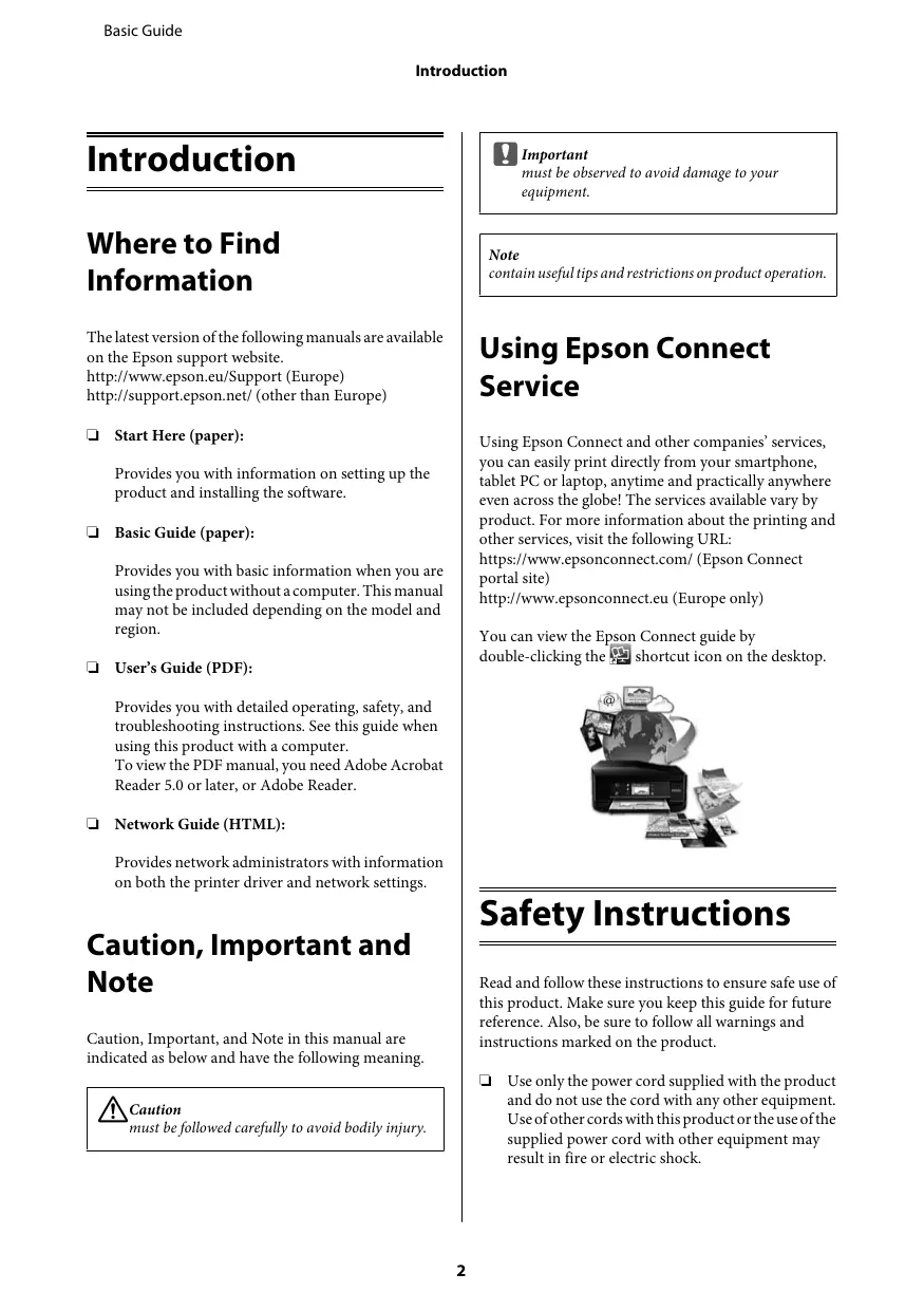 English Contents Basic Guide Introduction Important c must be observed to avoid damage to your Introduction equipment. Where to Find Information Note contain useful tips and restrictions on product operation. The latest version of the following manuals are available on the Epson support website. http://www.epson.eu/Support (Europe) http://support.epson.net/ (other than Europe) Using Epson Connect Service ❏ Start Here (paper): Using Epson Connect and other companies’ services, you can easily print directly from your smartphone, tablet PC or laptop, anytime and practically anywhere even across the globe! The services available vary by product. For more information about the printing and other services, visit the following URL: https://www.epsonconnect.com/ (Epson Connect portal site) http://www.epsonconnect.eu (Europe only) Provides you with information on setting up the product and installing the software. ❏ Basic Guide (paper): Provides you with basic information when you are using the product without a computer. This manual may not be included depending on the model and region. You can view the Epson Connect guide by double-clicking the shortcut icon on the desktop. ❏ User’s Guide (PDF): Provides you with detailed operating, safety, and troubleshooting instructions. See this guide when using this product with a computer. To view the PDF manual, you need Adobe Acrobat Reader 5.0 or later, or Adobe Reader. ❏ Network Guide (HTML): Provides network administrators with information on both the printer driver and network settings. Safety Instructions Caution, Important and Note Read and follow these instructions to ensure safe use of this product. Make sure you keep this guide for future reference. Also, be sure to follow all warnings and instructions marked on the product. Caution, Important, and Note in this manual are indicated as below and have the following meaning. ❏ Use only the power cord supplied with the product and do not use the cord with any other equipment. Use of other cords with this product or the use of the supplied power cord with other equipment may result in fire or electric shock.