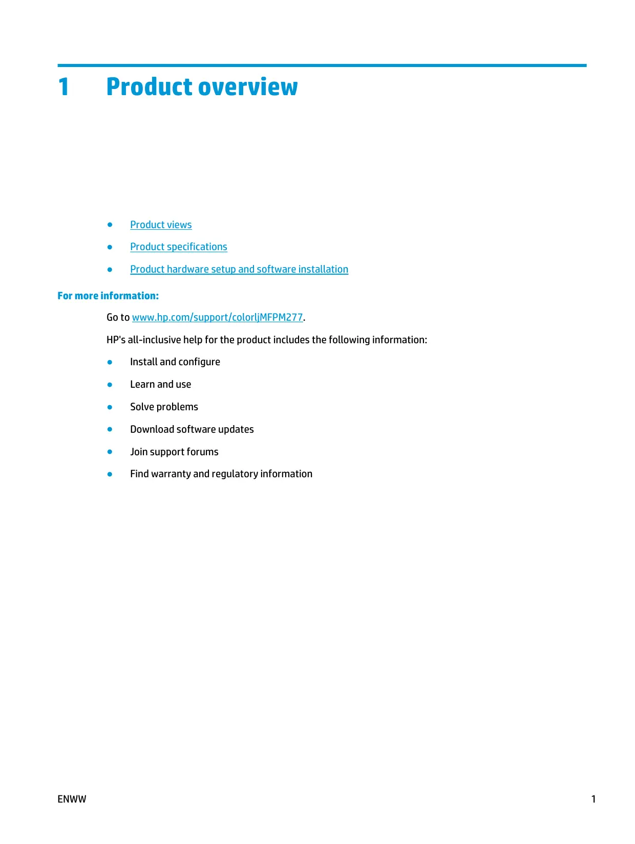 Product overview Product views Product specifications Product hardware setup and software installation For more information: ENWW Go to www.hp.com/support/colorljMFPM277. HP's all-inclusive help for the product includes the following information: Install and configure Learn and use Solve problems Download software updates Join support forums Find warranty and regulatory information
