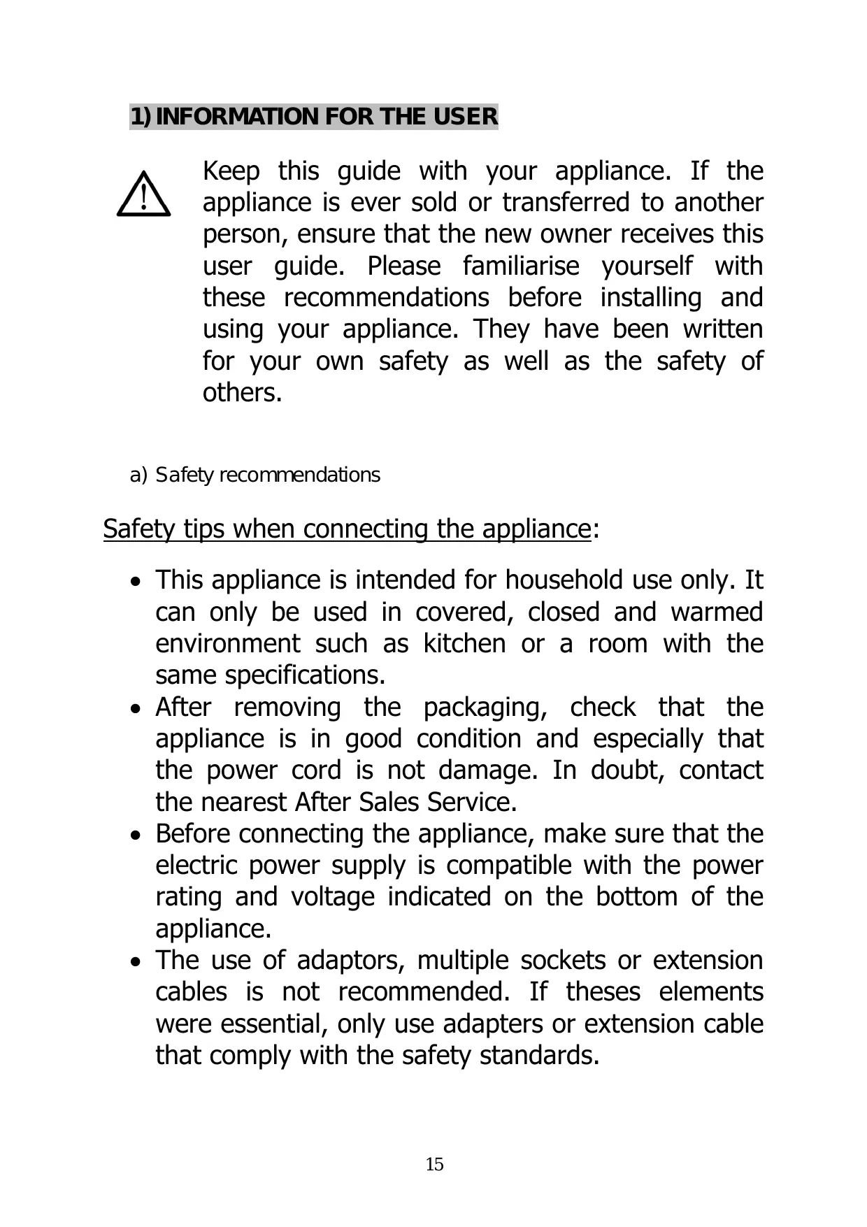 Keep this guide with your appliance. If the appliance is ever sold or transferred to another person, ensure that the new owner receives this user guide. Please familiarise yourself with these recommendations before installing and using your appliance. They have been written for your own safety as well as the safety of others.