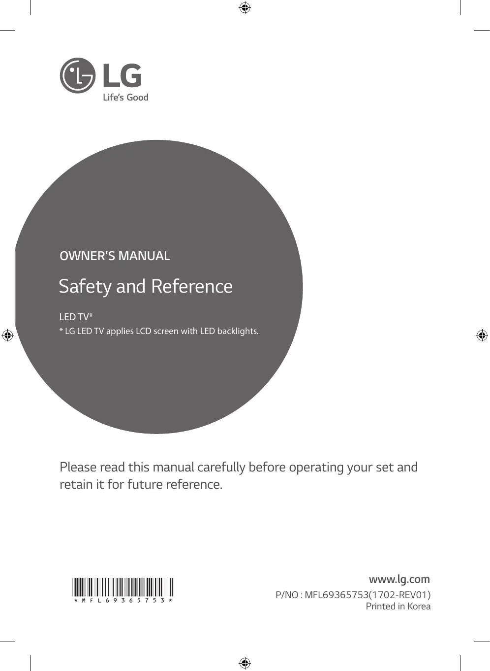 - LG LED TV applies LCD screen with LED backlights. Please read this manual carefully before operating your set and retain it for future reference. *MFL69365753* www.lg.com P/NO : MFL69365753(1702-REV01) Printed in Korea Warning! Safety instructions ENGLISH CAUTION
