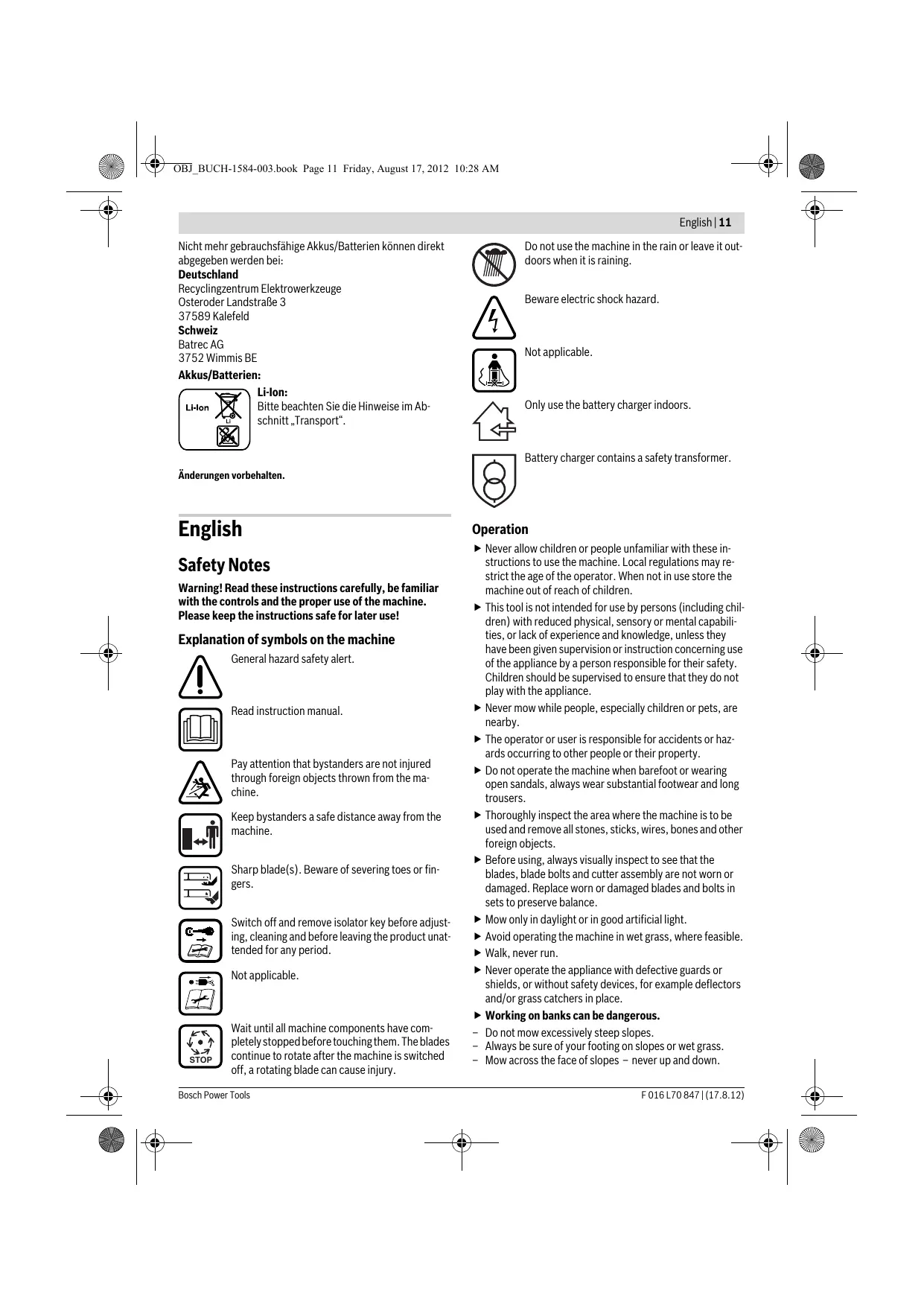 whenever you leave the machine, before clearing a blockage, before checking, cleaning or working on the machine, after striking a foreign object. Inspect the machine for damage and make repairs as necessary, – if the machine starts to vibrate abnormally (check immediately). Maintenance f Always wear gardening gloves when handling or working near the sharp blades. f Keep all nuts, bolts and screws tight to be sure that the machine is in safe working condition. f Check the grass catcher frequently for wear or deterioration. f Examine the machine and replace worn or damaged parts for safety. f Ensure replacement cutting means of the right type are used. f Ensure replacement parts fitted are Bosch approved. F 016 L70 847 | (17.8.12) Recommendations for Optimal Handling of the Battery f Ensure the switch is in the off position before inserting battery pack. Inserting the battery pack into machines that have the switch on invites accidents. f Keep the battery charger away from rain or moisture. Penetration of water in the battery charger increases the risk of an electric shock. f Recharge only with the charger specified by the manufacturer. A charger that is suitable for one type of battery pack may create a risk of fire when used with another battery pack. f Do not charge other batteries. The battery charger is suitable only for charging Bosch lithium ion batteries within the listed voltage range. Otherwise there is danger of fire and explosion. f Keep the battery charger clean. Contamination can lead to danger of an electric shock. f Before each use, check the battery charger, cable and plug. If damage is detected, do not use the battery charger. Never open the battery charger yourself. Have repairs performed only by a qualified technician and only using original spare parts. Damaged battery chargers, cables and plugs increase the risk of an electric shock. f Do not operate the battery charger on easily inflammable surfaces (e. g., paper, textiles, etc.) or surroundings. The heating of the battery charger during the charging process can pose a fire hazard. f Use only Bosch battery packs intended specifically for the machine. Use of any other battery packs may create a risk of injury and fire. f When battery pack is not in use, keep it away from other metal objects like paper clips, coins, keys, nails, screws, or other small metal objects that can make a connection from one terminal to another. Shorting the battery terminals together may cause burns or a fire. f Under abusive conditions, liquid may be ejected from the battery; avoid contact. If contact accidentally occurs, flush with water. If liquid contacts eyes, additionally seek medical help. Liquid ejected from the battery may cause irritations or burns. f Do not open the battery. Danger of short-circuiting. f Protect the battery against heat, e. g., against continuous intense sunlight, fire, water, and moisture. Danger of explosion. f Do not short-circuit the battery. There is danger of explosion. f In case of damage and improper use of the battery, vapours may be emitted. Ventilate the area and seek medical help in case of complaints. The vapours can irritate the respiratory system. f Protect the battery against moisture and water. f Store the battery only within a temperature range between 0 °C and 50 °C. As an example, do not leave the battery in the car in summer. f Occasionally clean the venting slots of the battery using a soft, clean and dry brush. Bosch Power Tools OBJ_BUCH-1584-003.book Page 13 Friday, August 17, 2012 10:28 AM English | 13 Symbols Symbol The following symbols are important for reading and understanding the operating instructions. Please take note of the symbols and their meaning. The correct interpretation of the symbols will help you to use the garden product in a better and safer manner. Symbol Meaning Weight Switching On Switching Off Meaning Reaction direction Permitted action Movement direction Accessories/Spare Parts Wear protective gloves Prohibited action Intended Use The garden product is intended for domestic lawn mowing. Technical Data Cordless Lawnmower Article number Blade width Height of cut Grassbox, capacity Weight according to EPTA-Procedure 01/2003 Serial number Battery Article number Rated voltage Capacity Charging period (battery discharged)** Number of battery cells Battery Charger Article number Charging current Allowable charging temperature range Weight according to EPTA-Procedure 01/2003 Protection class Battery Charger Article number **with AL 3620 CV Professional charger