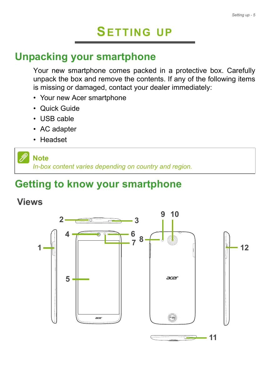 Settng up - 5 SETTING UP Unpacking your smartphone Your new smartphone comes packed in a protective box. Carefully unpack the box and remove the contents. If any of the following items is missing or damaged, contact your dealer immediately: + Your new Acer smartphone + Quick Guide + USB cable + AC adapter + Headset Note In-box content varies depending on country and region. Getting to know your smartphone Views
