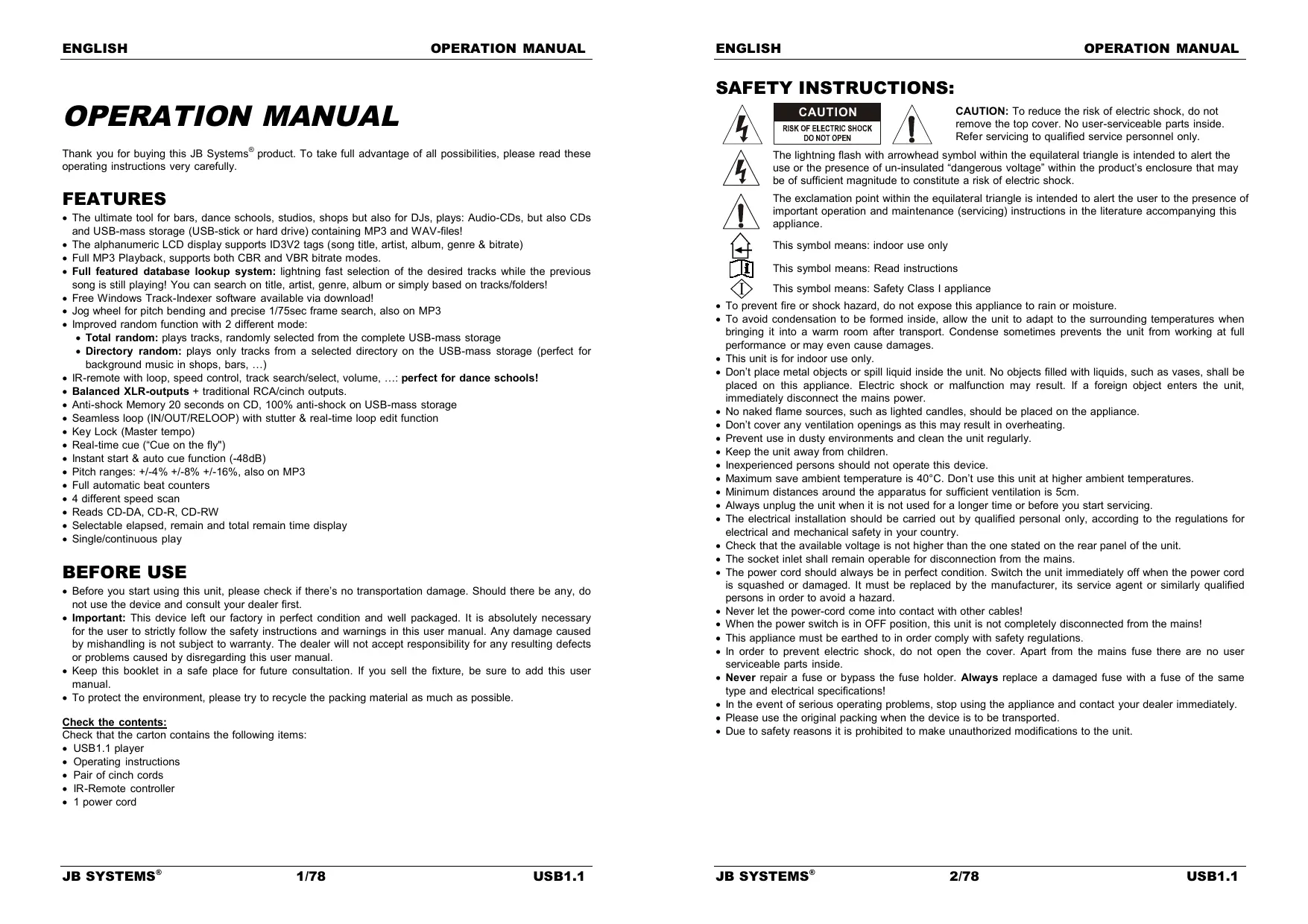 Dispose of the unit and used batteries in an environment friendly manner according to your country regulations. Thank you for buying this JB Systems product. To take full advantage of all possibilities, please read these operating instructions very carefully. FEATURES The ultimate tool for bars, dance schools, studios, shops but also for DJs, plays: Audio-CDs, but also CDs and USB-mass storage (USB-stick or hard drive) containing MP3 and WAV-files! The alphanumeric LCD display supports ID3V2 tags (song title, artist, album, genre & bitrate) Full MP3 Playback, supports both CBR and VBR bitrate modes. Full featured database lookup system: lightning fast selection of the desired tracks while the previous song is still playing! You can search on title, artist, genre, album or simply based on tracks/folders! Free Windows Track-Indexer software available via download! Jog wheel for pitch bending and precise 1/75sec frame search, also on MP3 Improved random function with 2 different mode: Total random: plays tracks, randomly selected from the complete USB-mass storage Directory random: plays only tracks from a selected directory on the USB-mass storage (perfect for background music in shops, bars, …) IR-remote with loop, speed control, track search/select, volume, …: perfect for dance schools! Balanced XLR-outputs + traditional RCA/cinch outputs. Anti-shock Memory 20 seconds on CD, 100% anti-shock on USB-mass storage Seamless loop (IN/OUT/RELOOP) with stutter & real-time loop edit function Key Lock (Master tempo) Real-time cue (“Cue on the fly") Instant start & auto cue function (-48dB) Pitch ranges: +/-4% +/-8% +/-16%, also on MP3 Full automatic beat counters 4 different speed scan Reads CD-DA, CD-R, CD-RW Selectable elapsed, remain and total remain time display Single/continuous play BEFORE USE Before you start using this unit, please check if there’s no transportation damage. Should there be any, do not use the device and consult your dealer first. Important: This device left our factory in perfect condition and well packaged. It is absolutely necessary for the user to strictly follow the safety instructions and warnings in this user manual. Any damage caused by mishandling is not subject to warranty. The dealer will not accept responsibility for any resulting defects or problems caused by disregarding this user manual. Keep this booklet in a safe place for future consultation. If you sell the fixture, be sure to add this user manual. To protect the environment, please try to recycle the packing material as much as possible. Check the contents: Check that the carton contains the following items: USB1.1 player Operating instructions Pair of cinch cords IR-Remote controller 1 power cord 1/78 OPERATION MANUAL SAFETY INSTRUCTIONS: OPERATION MANUAL JB SYSTEMS® ENGLISH USB1.1 CAUTION: To reduce the risk of electric shock, do not remove the top cover. No user-serviceable parts inside. Refer servicing to qualified service personnel only. The lightning flash with arrowhead symbol within the equilateral triangle is intended to alert the use or the presence of un-insulated “dangerous voltage” within the product’s enclosure that may be of sufficient magnitude to constitute a risk of electric shock. The exclamation point within the equilateral triangle is intended to alert the user to the presence of important operation and maintenance (servicing) instructions in the literature accompanying this appliance. This symbol means: indoor use only This symbol means: Read instructions This symbol means: Safety Class I appliance To prevent fire or shock hazard, do not expose this appliance to rain or moisture. To avoid condensation to be formed inside, allow the unit to adapt to the surrounding temperatures when bringing it into a warm room after transport. Condense sometimes prevents the unit from working at full performance or may even cause damages. This unit is for indoor use only. Don’t place metal objects or spill liquid inside the unit. No objects filled with liquids, such as vases, shall be placed on this appliance. Electric shock or malfunction may result. If a foreign object enters the unit, immediately disconnect the mains power. No naked flame sources, such as lighted candles, should be placed on the appliance. Don’t cover any ventilation openings as this may result in overheating. Prevent use in dusty environments and clean the unit regularly. Keep the unit away from children. Inexperienced persons should not operate this device. Maximum save ambient temperature is 40°C. Don’t use this unit at higher ambient temperatures. Minimum distances around the apparatus for sufficient ventilation is 5cm. Always unplug the unit when it is not used for a longer time or before you start servicing. The electrical installation should be carried out by qualified personal only, according to the regulations for electrical and mechanical safety in your country. Check that the available voltage is not higher than the one stated on the rear panel of the unit. The socket inlet shall remain operable for disconnection from the mains. The power cord should always be in perfect condition. Switch the unit immediately off when the power cord is squashed or damaged. It must be replaced by the manufacturer, its service agent or similarly qualified persons in order to avoid a hazard. Never let the power-cord come into contact with other cables! When the power switch is in OFF position, this unit is not completely disconnected from the mains! This appliance must be earthed to in order comply with safety regulations. In order to prevent electric shock, do not open the cover. Apart from the mains fuse there are no user serviceable parts inside. Never repair a fuse or bypass the fuse holder. Always replace a damaged fuse with a fuse of the same type and electrical specifications! In the event of serious operating problems, stop using the appliance and contact your dealer immediately. Please use the original packi