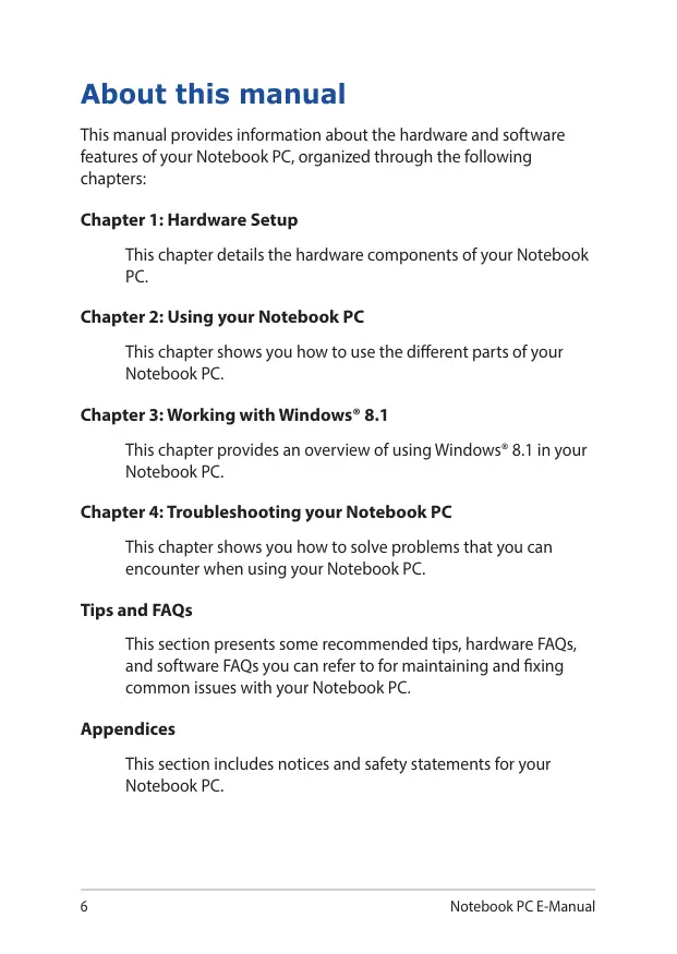 This chapter shows you how to solve problems that you can encounter when using your Notebook PC. Tips and FAQs This section presents some recommended tips, hardware FAQs, and software FAQs you can refer to for maintaining and fixing common issues with your Notebook PC. Appendices This section includes notices and safety statements for your Notebook PC. 6 Notebook PC E-Manual