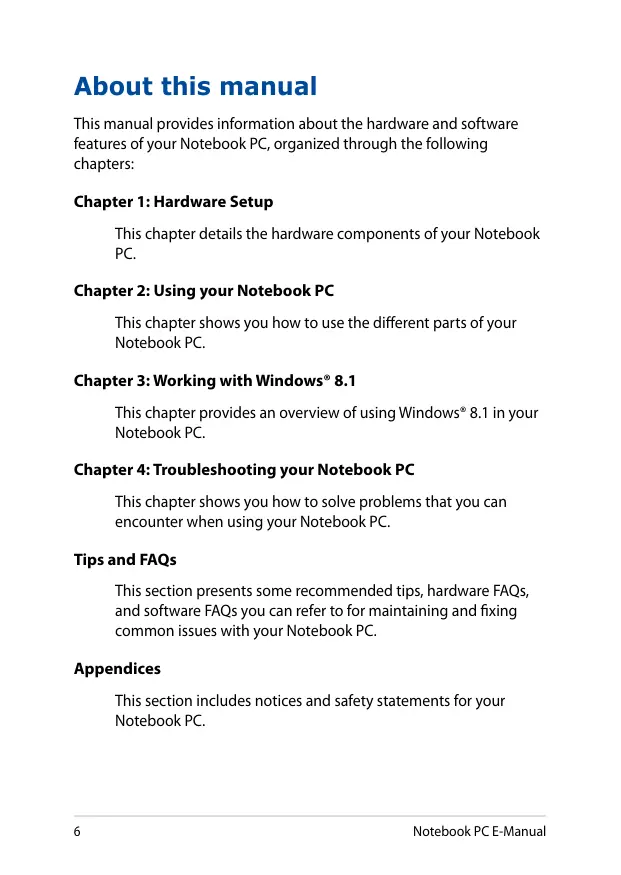 This chapter shows you how to solve problems that you can encounter when using your Notebook PC. Tips and FAQs This section presents some recommended tips, hardware FAQs, and software FAQs you can refer to for maintaining and fixing common issues with your Notebook PC. Appendices This section includes notices and safety statements for your Notebook PC. 6 Notebook PC E-Manual