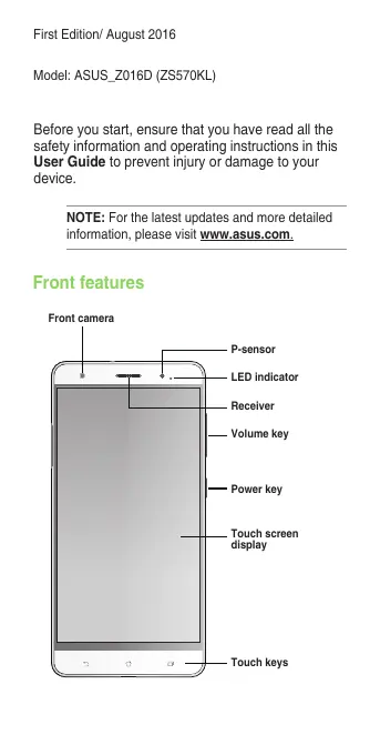 User Guide E11572 15060-80400000 First Edition/ August 2016 Model: ASUS_Z016D (ZS570KL) Before you start, ensure that you have read all the safety information and operating instructions in this User Guide to prevent injury or damage to your device. NOTE: For the latest updates and more detailed information, please visit www.asus.com. Front features Front camera P-sensor LED indicator Receiver Volume key Power key Touch screen display Touch keys Side features Audio jack Microphone Micro SIM, nano SIM/ microSD combo card slot Volume key Power key Microphone USB Type-C port Speaker NOTES: