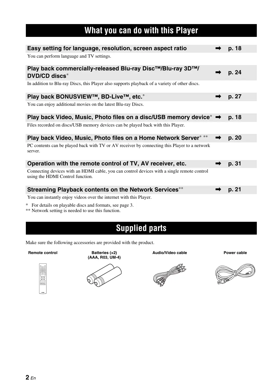 – “Finalizar” hace referencia a un procesamiento al que se somete un disco grabado para que se pueda reproducir en otros reproductores/grabadores, así como en este reproductor. Solo pueden reproducirse en el reproductor los discos que se hayan finalizado. (Este reproductor no dispone de una función para finalizar discos.) – No se garantiza la reproducción de todos los archivos de un disco, dispositivo de memoria USB y de la red. – Un archivo con protección de los derechos de autor no se puede reproducir a través de un dispositivo de memoria USB o red.