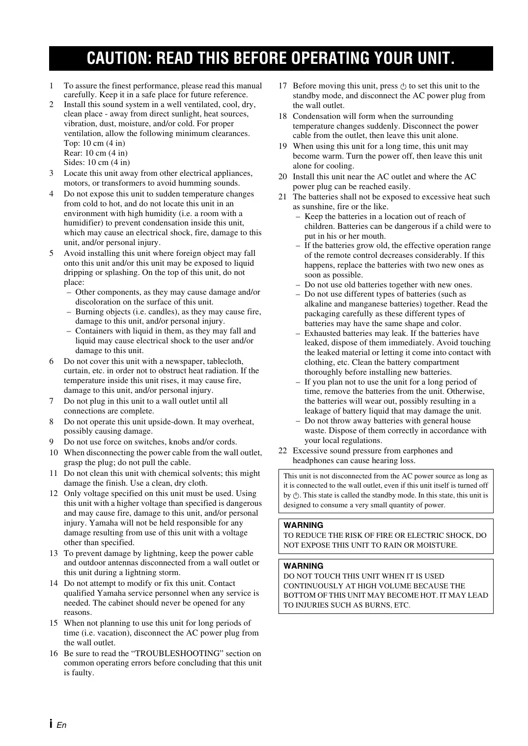 Install this sound system in a well ventilated, cool, dry, clean place - away from direct sunlight, heat sources, vibration, dust, moisture, and/or cold. For proper ventilation, allow the following minimum clearances. Top: 10 cm (4 in) Rear: 10 cm (4 in) Sides: 10 cm (4 in) Locate this unit away from other electrical appliances, motors, or transformers to avoid humming sounds. Do not expose this unit to sudden temperature changes from cold to hot, and do not locate this unit in an environment with high humidity (i.e. a room with a humidifier) to prevent condensation inside this unit, which may cause an electrical shock, fire, damage to this unit, and/or personal injury. Avoid installing this unit where foreign object may fall onto this unit and/or this unit may be exposed to liquid dripping or splashing. On the top of this unit, do not place: – Other components, as they may cause damage and/or discoloration on the surface of this unit. – Burning objects (i.e. candles), as they may cause fire, damage to this unit, and/or personal injury. – Containers with liquid in them, as they may fall and liquid may cause electrical shock to the user and/or damage to this unit. Do not cover this unit with a newspaper, tablecloth, curtain, etc. in order not to obstruct heat radiation. If the temperature inside this unit rises, it may cause fire, damage to this unit, and/or personal injury. Do not plug in this unit to a wall outlet until all connections are complete. Do not operate this unit upside-down. It may overheat, possibly causing damage. Do not use force on switches, knobs and/or cords. When disconnecting the power cable from the wall outlet, grasp the plug; do not pull the cable. Do not clean this unit with chemical solvents; this might damage the finish. Use a clean, dry cloth. Only voltage specified on this unit must be used. Using this unit with a higher voltage than specified is dangerous and may cause fire, damage to this unit, and/or personal injury. Yamaha will not be held responsible for any damage resulting from use of this unit with a voltage other than specified. To prevent damage by lightning, keep the power cable and outdoor antennas disconnected from a wall outlet or this unit during a lightning storm. Do not attempt to modify or fix this unit. Contact qualified Yamaha service personnel when any service is needed. The cabinet should never be opened for any reasons. When not planning to use this unit for long periods of time (i.e. vacation), disconnect the AC power plug from the wall outlet. Be sure to read the “TROUBLESHOOTING” section on common operating errors before concluding that this unit is faulty.