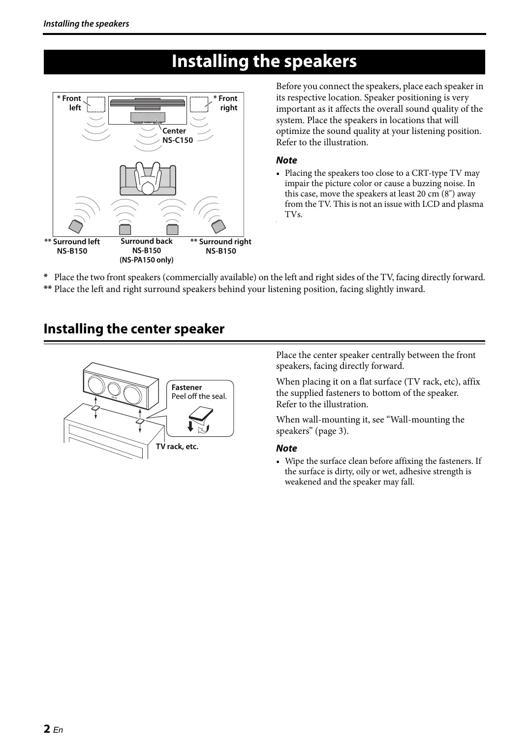 Place the center speaker centrally between the front speakers, facing directly forward. Fastener Peel off the seal.