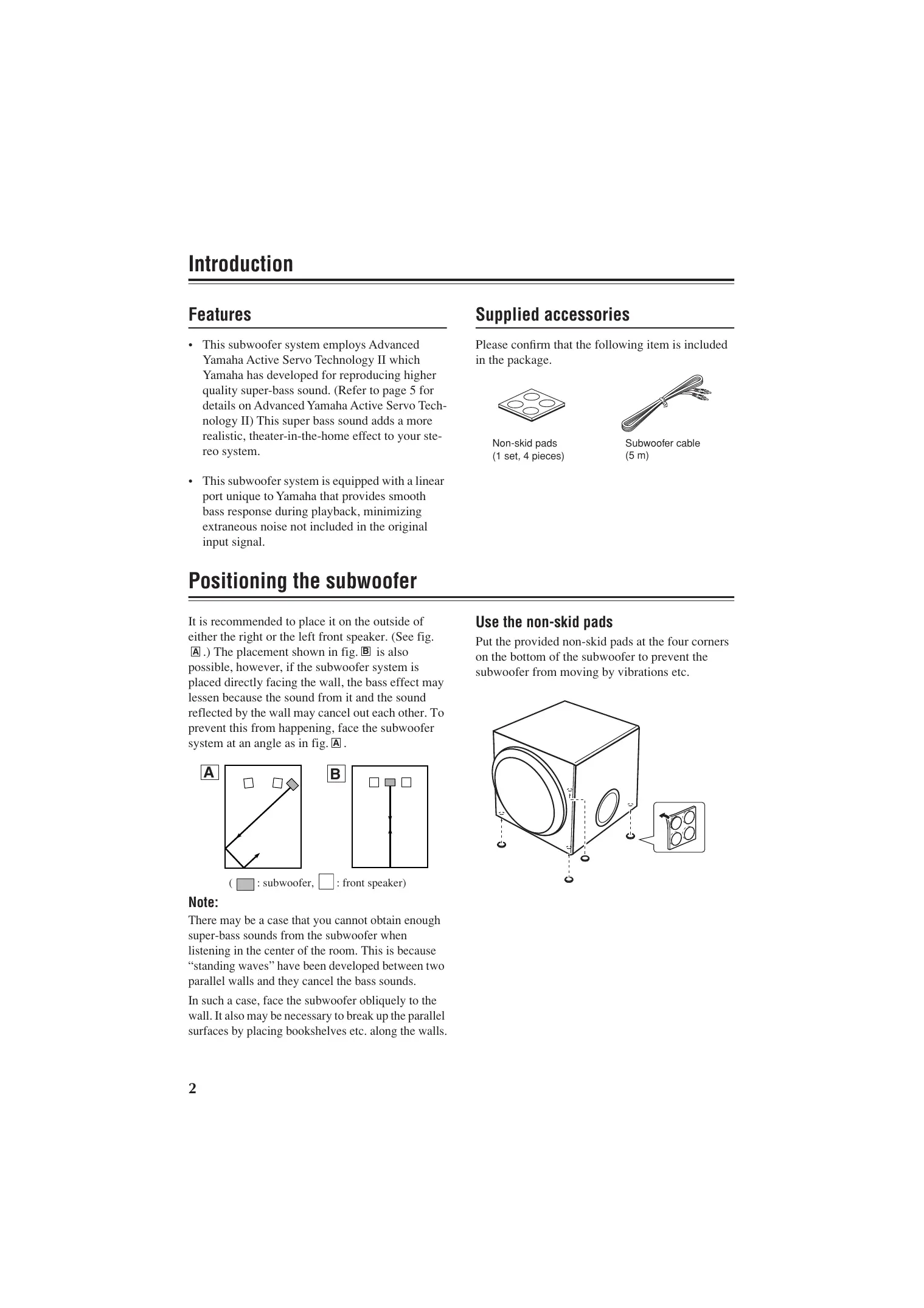 Put the provided non-skid pads at the four corners on the bottom of the subwoofer to prevent the subwoofer from moving by vibrations etc.