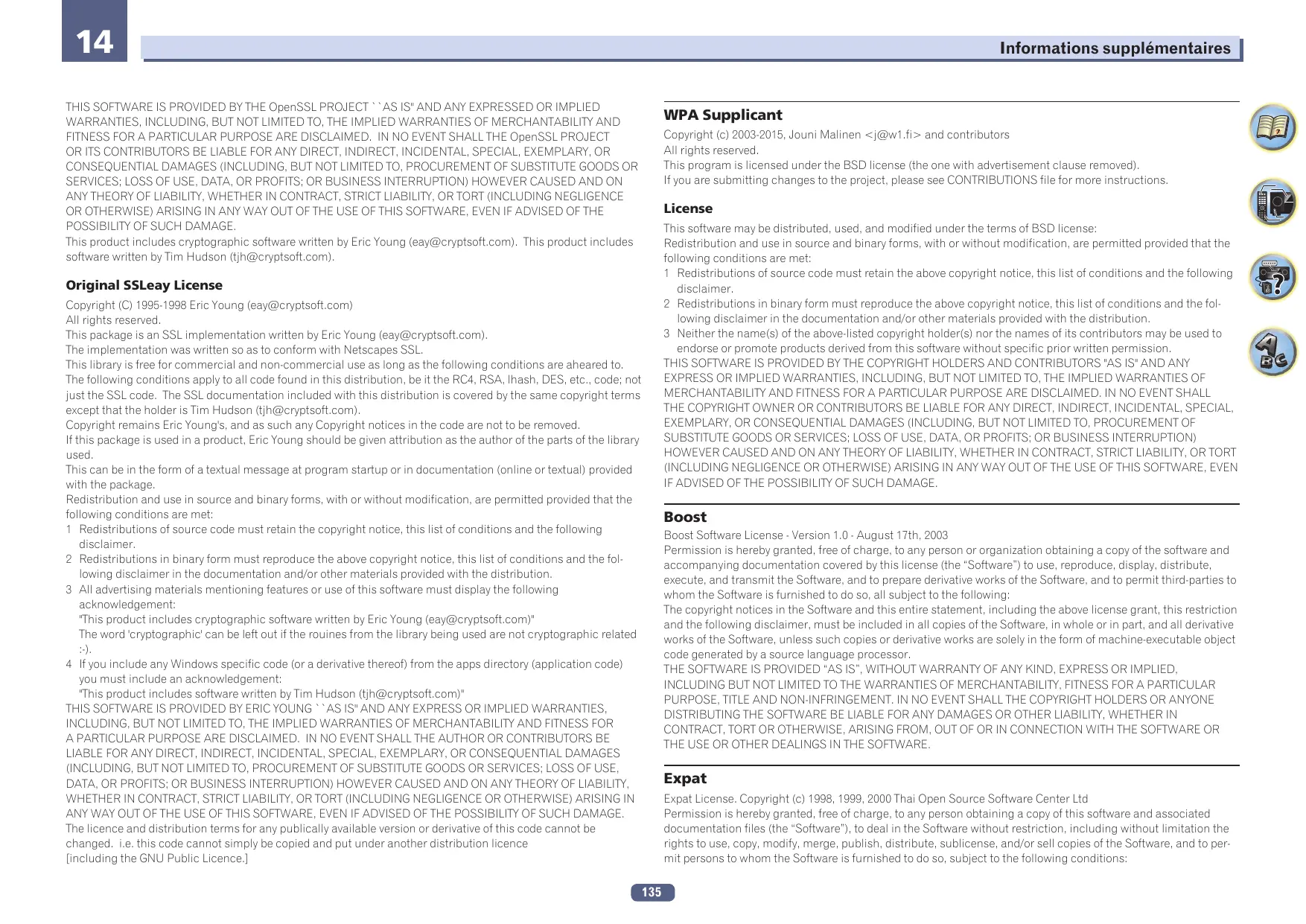Informations supplémentaires THIS SOFTWARE IS PROVIDED BY THE OpenSSL PROJECT ``AS IS'' AND ANY EXPRESSED OR IMPLIED WARRANTIES, INCLUDING, BUT NOT LIMITED TO, THE IMPLIED WARRANTIES OF MERCHANTABILITY AND FITNESS FOR A PARTICULAR PURPOSE ARE DISCLAIMED. IN NO EVENT SHALL THE OpenSSL PROJECT OR ITS CONTRIBUTORS BE LIABLE FOR ANY DIRECT, INDIRECT, INCIDENTAL, SPECIAL, EXEMPLARY, OR CONSEQUENTIAL DAMAGES (INCLUDING, BUT NOT LIMITED TO, PROCUREMENT OF SUBSTITUTE GOODS OR SERVICES; LOSS OF USE, DATA, OR PROFITS; OR BUSINESS INTERRUPTION) HOWEVER CAUSED AND ON ANY THEORY OF LIABILITY, WHETHER IN CONTRACT, STRICT LIABILITY, OR TORT (INCLUDING NEGLIGENCE OR OTHERWISE) ARISING IN ANY WAY OUT OF THE USE OF THIS SOFTWARE, EVEN IF ADVISED OF THE POSSIBILITY OF SUCH DAMAGE. This product includes cryptographic software written by Eric Young (eay@cryptsoft.com). This product includes software written by Tim Hudson (tjh@cryptsoft.com). WPA Supplicant Copyright (c) 2003-2015, Jouni Malinen <j@w1.fi> and contributors All rights reserved. This program is licensed under the BSD license (the one with advertisement clause removed). If you are submitting changes to the project, please see CONTRIBUTIONS file for more instructions. License This software may be distributed, used, and modified under the terms of BSD license: Redistribution and use in source and binary forms, with or without modification, are permitted provided that the following conditions are met: 1 Redistributions of source code must retain the above copyright notice, this list of conditions and the following disclaimer. 2 Redistributions in binary form must reproduce the above copyright notice, this list of conditions and the following disclaimer in the documentation and/or other materials provided with the distribution. 3 Neither the name(s) of the above-listed copyright holder(s) nor the names of its contributors may be used to endorse or promote products derived from this software without specific prior written permission. THIS SOFTWARE IS PROVIDED BY THE COPYRIGHT HOLDERS AND CONTRIBUTORS "AS IS" AND ANY EXPRESS OR IMPLIED WARRANTIES, INCLUDING, BUT NOT LIMITED TO, THE IMPLIED WARRANTIES OF MERCHANTABILITY AND FITNESS FOR A PARTICULAR PURPOSE ARE DISCLAIMED. IN NO EVENT SHALL THE COPYRIGHT OWNER OR CONTRIBUTORS BE LIABLE FOR ANY DIRECT, INDIRECT, INCIDENTAL, SPECIAL, EXEMPLARY, OR CONSEQUENTIAL DAMAGES (INCLUDING, BUT NOT LIMITED TO, PROCUREMENT OF SUBSTITUTE GOODS OR SERVICES; LOSS OF USE, DATA, OR PROFITS; OR BUSINESS INTERRUPTION) HOWEVER CAUSED AND ON ANY THEORY OF LIABILITY, WHETHER IN CONTRACT, STRICT LIABILITY, OR TORT (INCLUDING NEGLIGENCE OR OTHERWISE) ARISING IN ANY WAY OUT OF THE USE OF THIS SOFTWARE, EVEN IF ADVISED OF THE POSSIBILITY OF SUCH DAMAGE. Original SSLeay License Copyright (C) 1995-1998 Eric Young (eay@cryptsoft.com) All rights reserved. This package is an SSL implementation written by Eric Young (eay@cryptsoft.com). The implementation was written so as to conform with Netscapes SSL. This library is free for commercial and non-commercial use as long as the following conditions are aheared to. The following conditions apply to all code found in this distribution, be it the RC4, RSA, lhash, DES, etc., code; not just the SSL code. The SSL documentation included with this distribution is covered by the same copyright terms except that the holder is Tim Hudson (tjh@cryptsoft.com). Copyright remains Eric Young's, and as such any Copyright notices in the code are not to be removed. If this package is used in a product, Eric Young should be given attribution as the author of the parts of the library used. This can be in the form of a textual message at program startup or in documentation (online or textual) provided with the package. Redistribution and use in source and binary forms, with or without modification, are permitted provided that the following conditions are met: 1 Redistributions of source code must retain the copyright notice, this list of conditions and the following disclaimer. 2 Redistributions in binary form must reproduce the above copyright notice, this list of conditions and the following disclaimer in the documentation and/or other materials provided with the distribution. 3 All advertising materials mentioning features or use of this software must display the following acknowledgement: "This product includes cryptographic software written by Eric Young (eay@cryptsoft.com)" The word 'cryptographic' can be left out if the rouines from the library being used are not cryptographic related 4 If you include any Windows specific code (or a derivative thereof) from the apps directory (application code) you must include an acknowledgement: "This product includes software written by Tim Hudson (tjh@cryptsoft.com)" THIS SOFTWARE IS PROVIDED BY ERIC YOUNG ``AS IS'' AND ANY EXPRESS OR IMPLIED WARRANTIES, INCLUDING, BUT NOT LIMITED TO, THE IMPLIED WARRANTIES OF MERCHANTABILITY AND FITNESS FOR A PARTICULAR PURPOSE ARE DISCLAIMED. IN NO EVENT SHALL THE AUTHOR OR CONTRIBUTORS BE LIABLE FOR ANY DIRECT, INDIRECT, INCIDENTAL, SPECIAL, EXEMPLARY, OR CONSEQUENTIAL DAMAGES (INCLUDING, BUT NOT LIMITED TO, PROCUREMENT OF SUBSTITUTE GOODS OR SERVICES; LOSS OF USE, DATA, OR PROFITS; OR BUSINESS INTERRUPTION) HOWEVER CAUSED AND ON ANY THEORY OF LIABILITY, WHETHER IN CONTRACT, STRICT LIABILITY, OR TORT (INCLUDING NEGLIGENCE OR OTHERWISE) ARISING IN ANY WAY OUT OF THE USE OF THIS SOFTWARE, EVEN IF ADVISED OF THE POSSIBILITY OF SUCH DAMAGE. The licence and distribution terms for any publically available version or derivative of this code cannot be changed. i.e. this code cannot simply be copied and put under another distribution licence [including the GNU Public Licence.] Boost Boost Software License - Version 1.0 - August 17th, 2003 Permission is hereby granted, free of charge, to any person or organization obtaining a copy of the software and accompanying documentation covered by this license (the “Software”) to use, reproduce