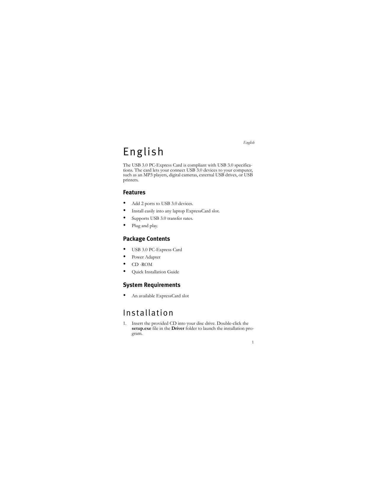 Install easily into any laptop ExpressCard slot. Supports USB 3.0 transfer rates. Plug and play.