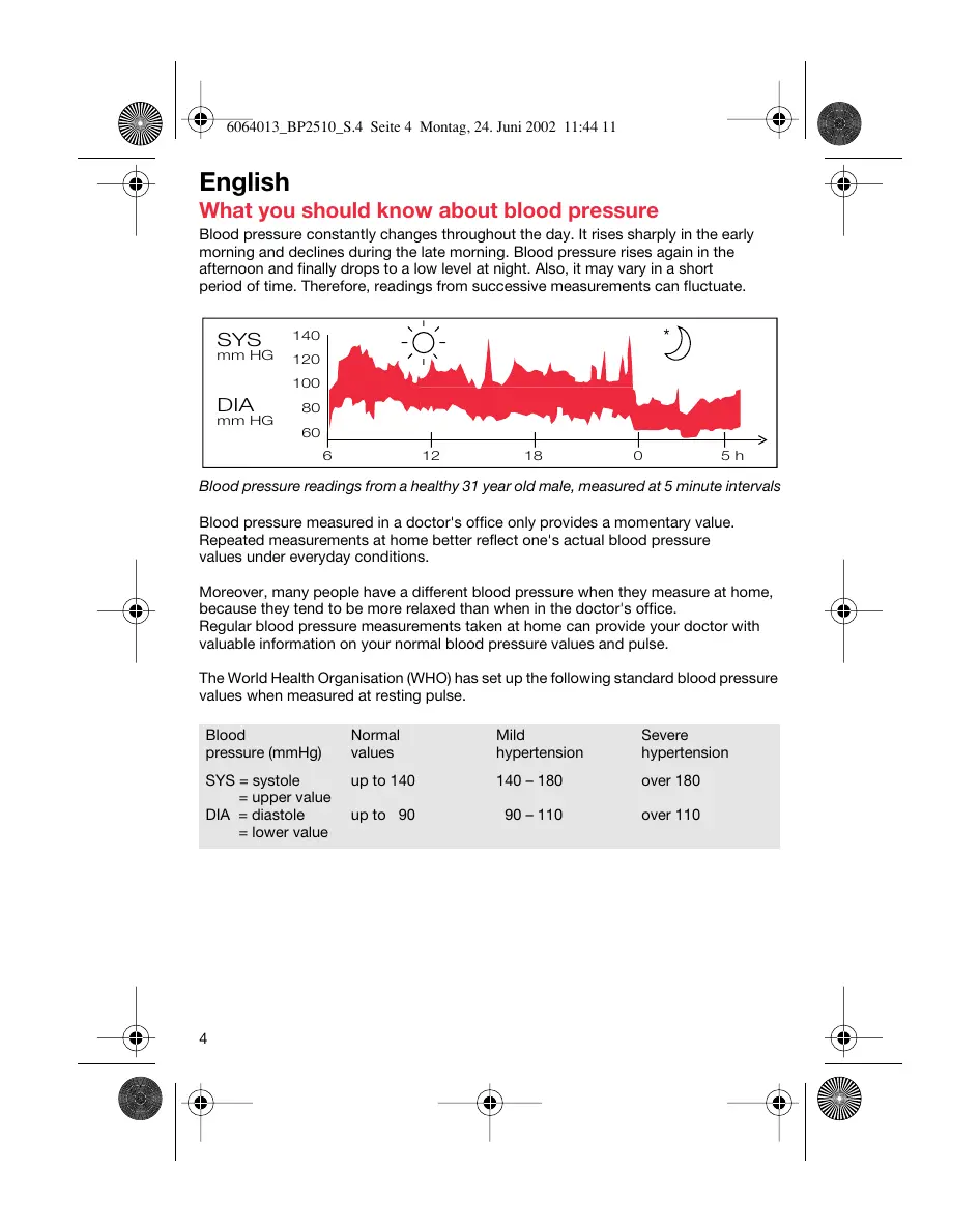 6-064-013/02/II-03/G2 GB/F/NL/E/P Printed in Germany English What you should know about blood pressure Blood pressure constantly changes throughout the day. It rises sharply in the early morning and declines during the late morning. Blood pressure rises again in the afternoon and finally drops to a low level at night. Also, it may vary in a short period of time. Therefore, readings from successive measurements can fluctuate. SYS