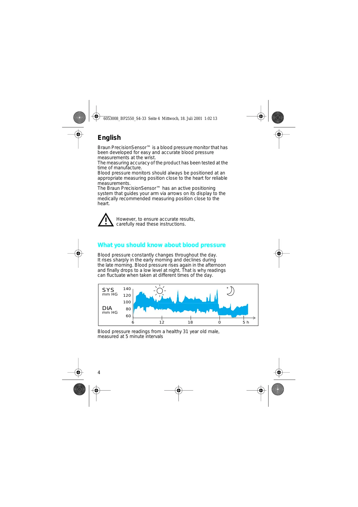Thank you for purchasing a Braun product. We hope you are completely satisfied with your new Braun PrecisionSensor™. If you have any questions, please call: 1-888-848-2572 English Braun PrecisionSensor™ is a blood pressure monitor that has been developed for easy and accurate blood pressure measurements at the wrist. The measuring accuracy of the product has been tested at the time of manufacture. Blood pressure monitors should always be positioned at an appropriate measuring position close to the heart for reliable measurements. The Braun PrecisionSensor™ has an active positioning system that guides your arm via arrows on its display to the medically recommended measuring position close to the heart. However, to ensure accurate results, carefully read these instructions. What you should know about blood pressure Blood pressure constantly changes throughout the day. It rises sharply in the early morning and declines during the late morning. Blood pressure rises again in the afternoon and finally drops to a low level at night. That is why readings can fluctuate when taken at different times of the day. SYS