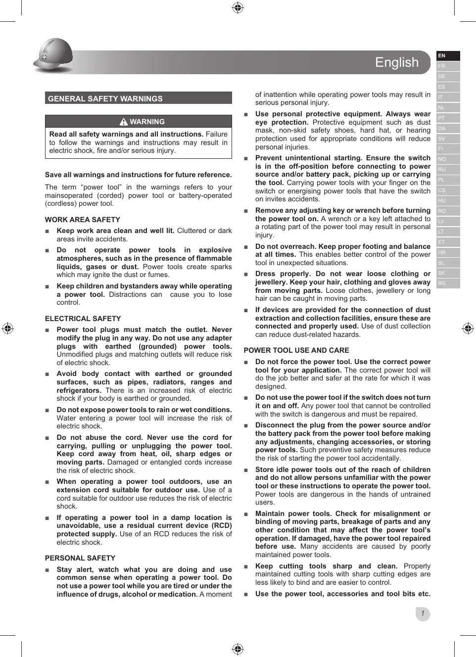 GENERAL SAFETY WARNINGS WARNING Read all safety warnings and all instructions. Failure to follow the warnings and instructions may result in