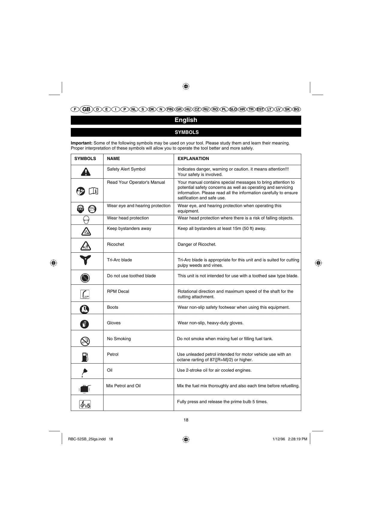 English SYMBOLS Important: Some of the following symbols may be used on your tool. Please study them and learn their meaning. Proper interpretation of these symbols will allow you to operate the tool better and more safely. SYMBOLS NAME EXPLANATION Conforms to all regulatory standards in the country in the EU where the product is purchased. Thank you for buying a Ryobi trimmer/brushcutter. Your new trimmer/brushcutter has been engineered and manufactured to Ryobi’s high standard for dependability, ease of operation, and operator safety. Properly cared for, it will give you years of rugged, trouble-free performance.