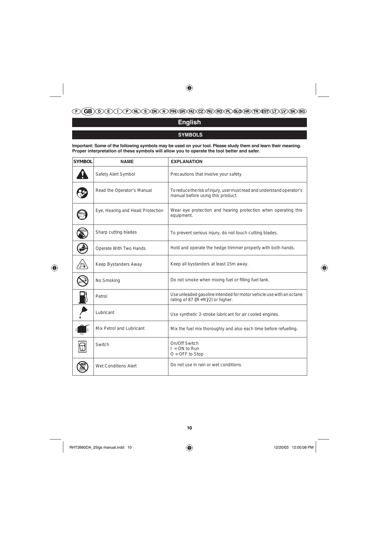 12/20/03 12:00:08 PM F GB D E I P NL S DK N FIN GR HU CZ RU RO PL SLO HR TR EST LT LV SK BG English SYMBOLS The following signal words and meanings are intended to explain the levels of risk associated with this product.