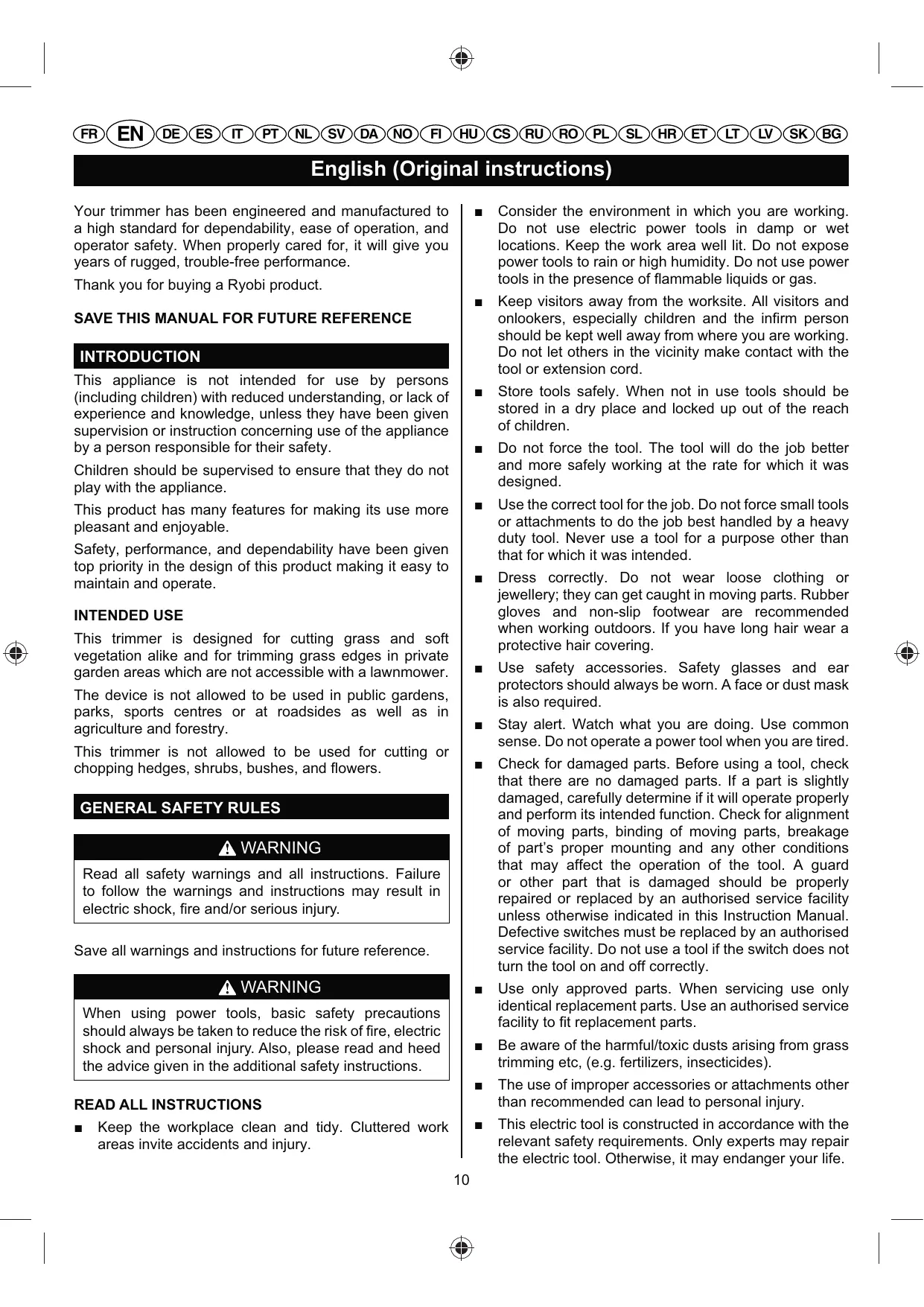 English (Original instructions) Your trimmer has been engineered and manufactured to a high standard for dependability, ease of operation, and operator safety. When properly cared for, it will give you years of rugged, trouble-free performance.