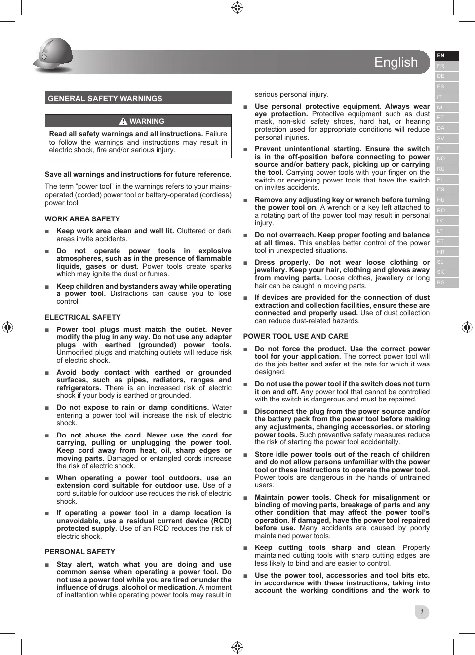 When operating a power tool outdoors, use an extension cord suitable for outdoor use. Use of a cord suitable for outdoor use reduces the risk of electric VKRFN If operating a power tool in a damp location is unavoidable, use a residual current device (RCD) protected supply. Use of an RCD reduces the risk of HOHFWULFVKRFN PERSONAL SAFETY