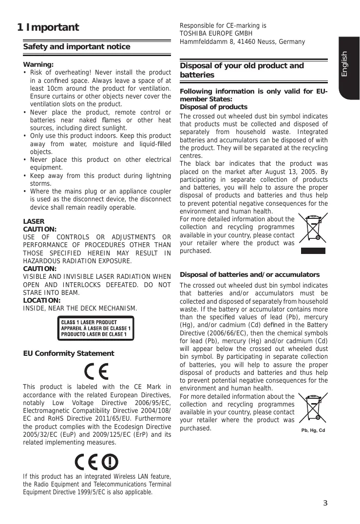 Responsible for CE-marking is TOSHIBA EUROPE GMBH Hammfelddamm 8, 41460 Neuss, Germany