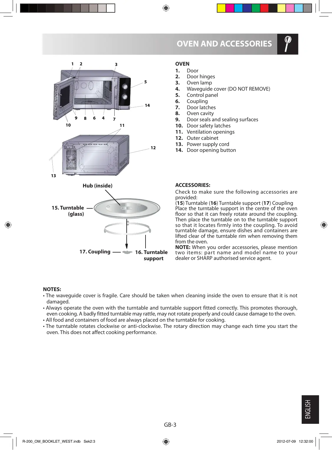 When heating food in plastic or paper containers, monitor the oven due to the possibility of ignition. ENGLISH Cookware GB-9 R-200_OM_BOOKLET_WEST.indb Sek2:9 2012-07-09 12:32:01