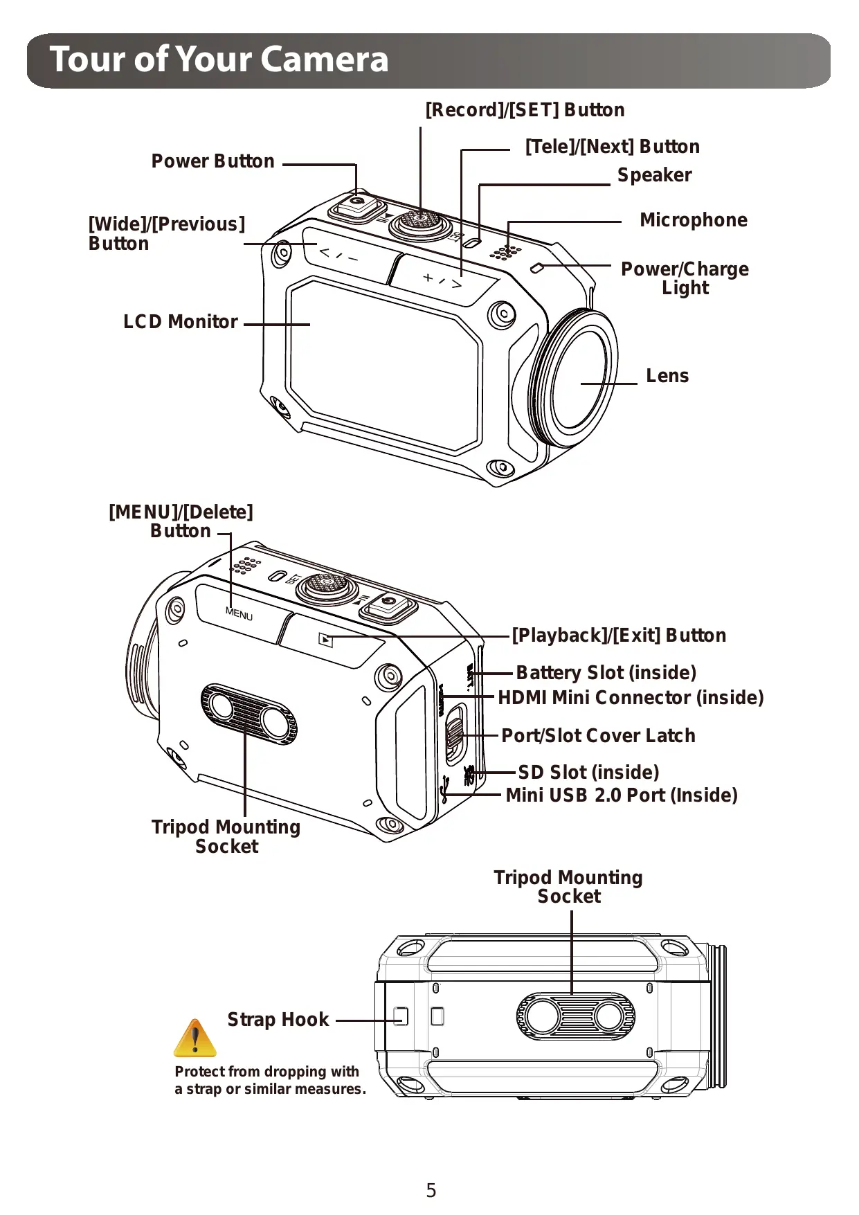 Tour of Your Camera [Record]J/ISET] Button [Tele]/INext] Button Speaker Power Button [WideJ[Previous] Microphone Button Power/Charge Light LCD Monitor Button [Playback]/[E xit] Button Battery Slot (inside) HDMI Mini Connector (inside) Port/Slot Cover Latch à SD Slot (inside) RE Mini USB 2.0 Port (Inside) Tripod Mounting Socket Tripod Mounting Socket A Strap Hook [), 0 Lo] Protect from dropping with Le ) a strap or similar measures. — 27
