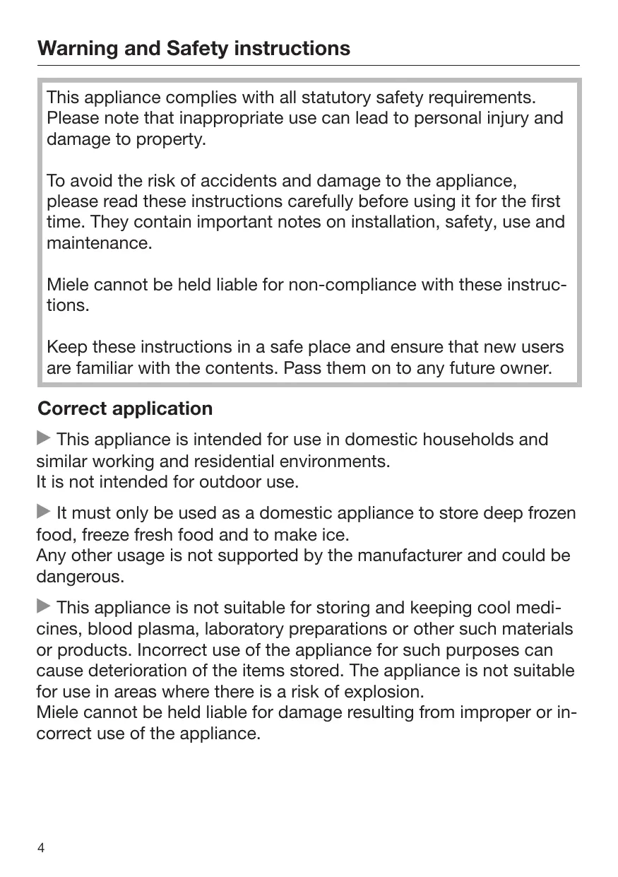 Warning and Safety instructions This appliance complies with all statutory safety requirements. Please note that inappropriate use can lead to personal injury and damage to property. To avoid the risk of accidents and damage to the appliance, please read these instructions carefully before using it for the first time. They contain important notes on installation, safety, use and maintenance. Miele cannot be held liable for non-compliance with these instructions. Keep these instructions in a safe place and ensure that new users are familiar with the contents. Pass them on to any future owner. Correct application This appliance is intended for use in domestic households and similar working and residential environments. It is not intended for outdoor use. It must only be used as a domestic appliance to store deep frozen food, freeze fresh food and to make ice. Any other usage is not supported by the manufacturer and could be dangerous. This appliance is not suitable for storing and keeping cool medicines, blood plasma, laboratory preparations or other such materials or products. Incorrect use of the appliance for such purposes can cause deterioration of the items stored. The appliance is not suitable for use in areas where there is a risk of explosion. Miele cannot be held liable for damage resulting from improper or incorrect use of the appliance.