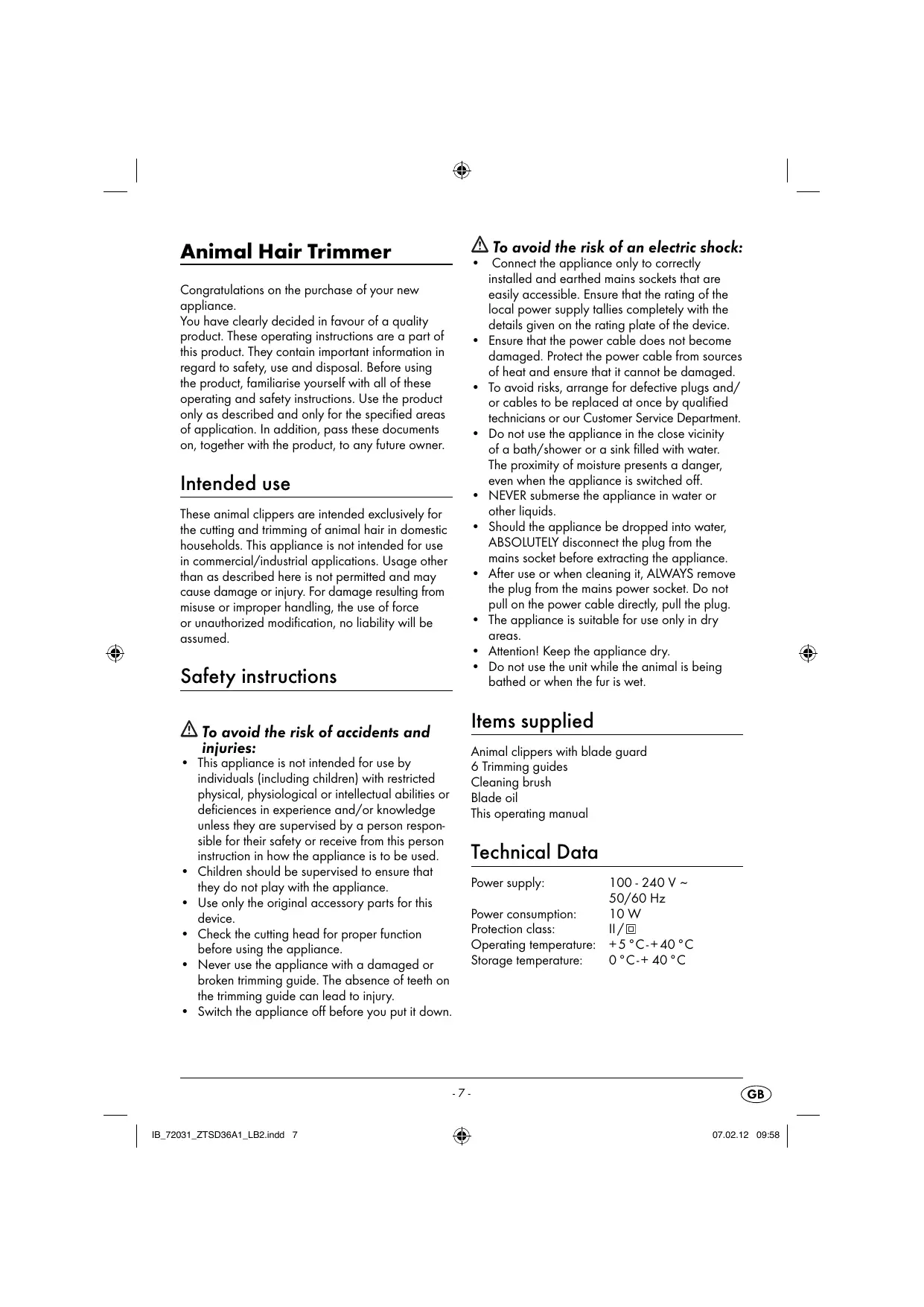 These animal clippers are intended exclusively for the cutting and trimming of animal hair in domestic households. This appliance is not intended for use in commercial/industrial applications. Usage other than as described here is not permitted and may cause damage or injury. For damage resulting from misuse or improper handling, the use of force or unauthorized modification, no liability will be assumed.