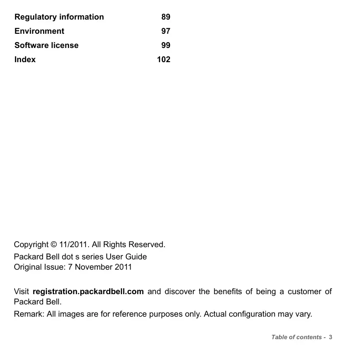 Copyright © 11/2011. All Rights Reserved. Packard Bell dot s series User Guide Original Issue: 7 November 2011 Visit registration.packardbell.com and discover the benefits of being a customer of Packard Bell. Remark: All images are for reference purposes only. Actual configuration may vary. Table of contents - 3