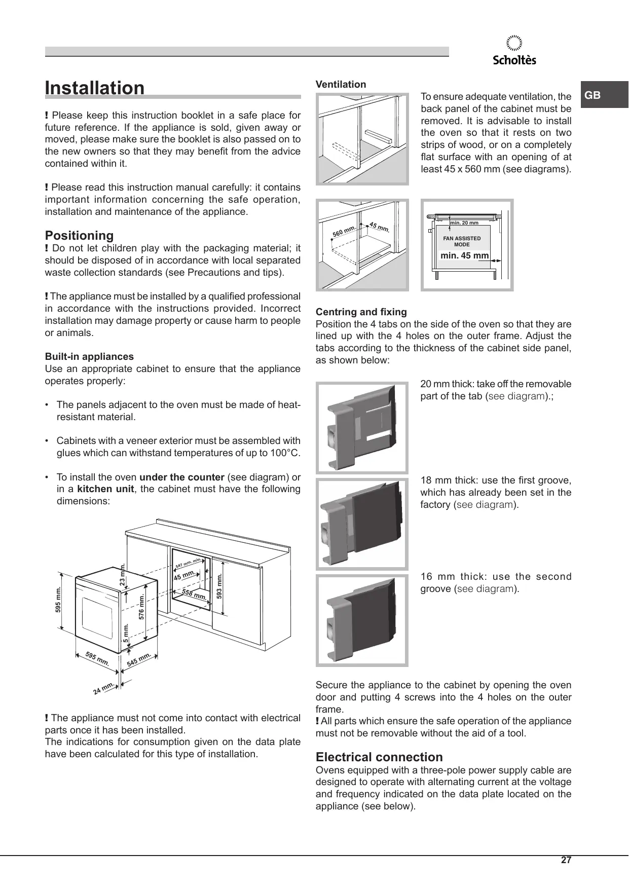 FAN ASSISTED MODE min. 45 mm Centring and fixing Position the 4 tabs on the side of the oven so that they are lined up with the 4 holes on the outer frame. Adjust the tabs according to the thickness of the cabinet side panel, as shown below: 20 mm thick: take off the removable part of the tab (see diagram).;