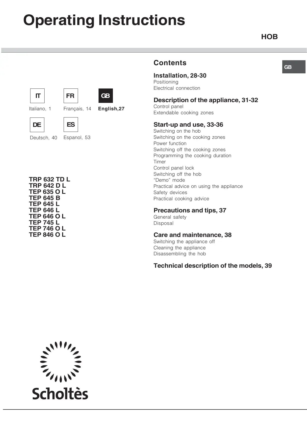 TRP642DL - Hob SCHOLTES - Free user manual and instructions