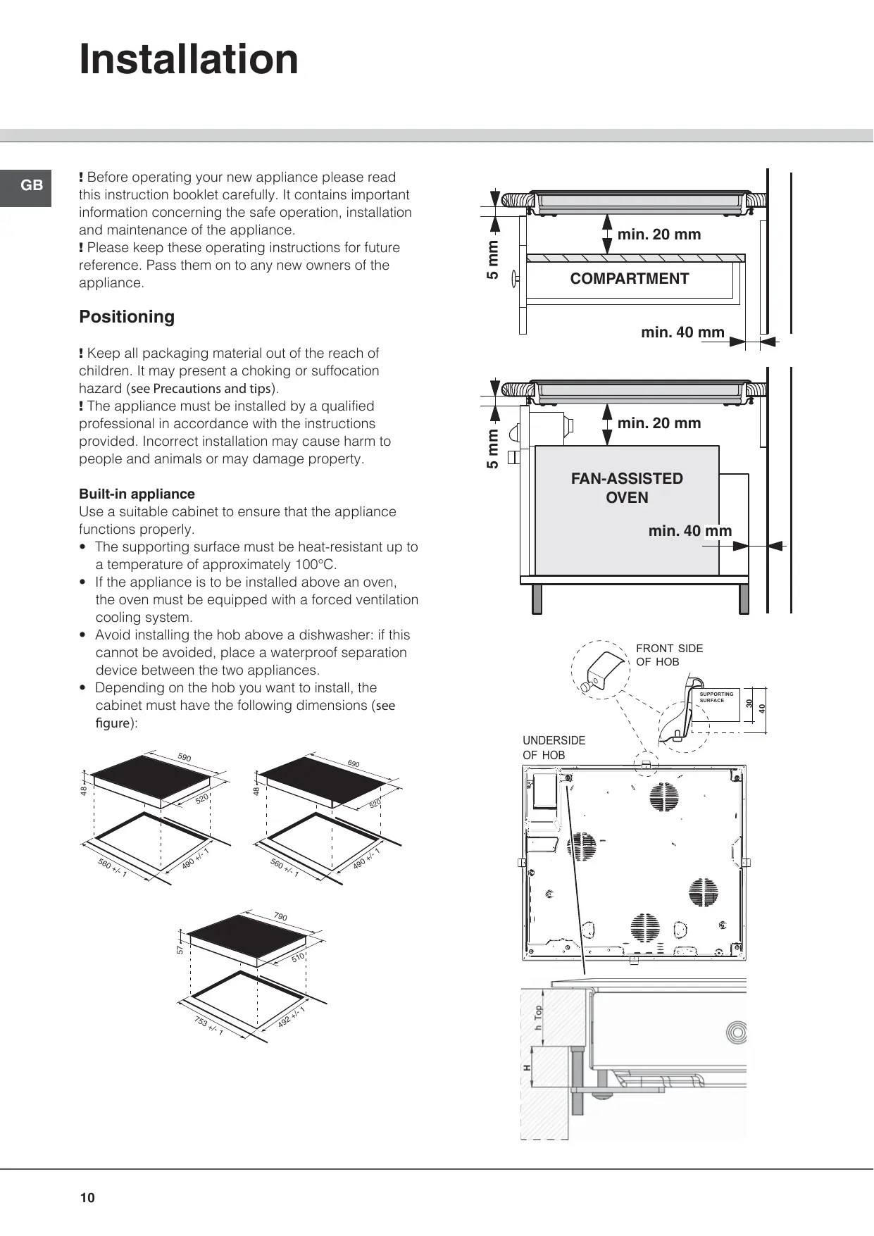 Ventilation To allow adequate ventilation and to avoid overheating of the surrounding surfaces the hob should be positioned as follows: