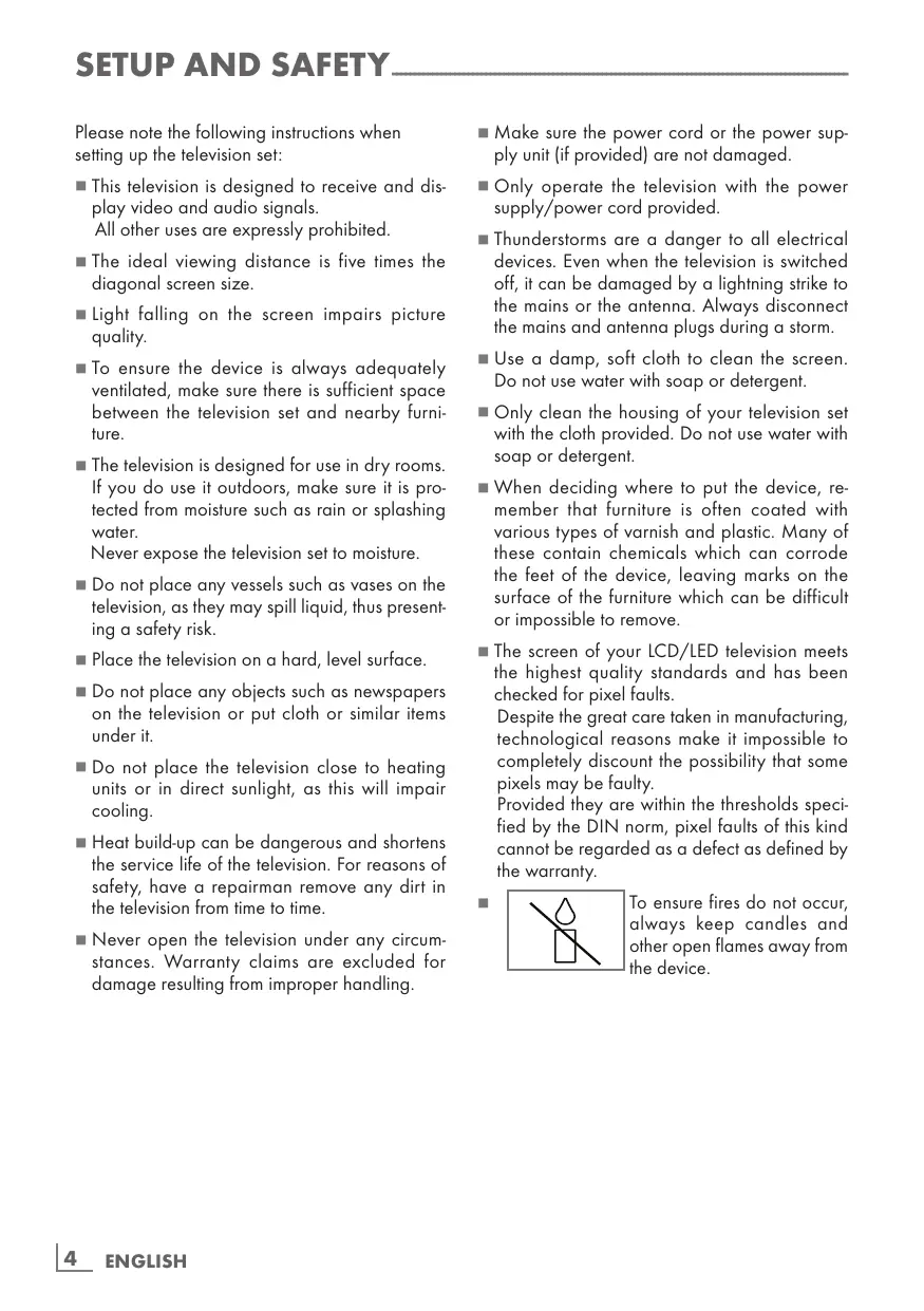 Please note the following instructions when setting up the television set: m This television is designed to receive and dis- play video and audio signals. All other uses are expressly prohibited. m The ideal viewing distance is five times the diagonal screen size. # Light falling on the screen impairs picture quality. m To ensure the device is always adequately ventilated, make sure there is sufficient space between the television set and nearby furni- ture. m The television is designed for use in dry rooms. IF you do use it outdoors, make sure it is pro- tected from moisture such as rain or splashing water. Never expose the television set to moisture. # Do not place any vessels such as vases on the television, as they may spill liquid, thus present ing a safety risk. # Place the television on a hard, level surface. m# Do not place any objects such as newspapers on the television or put cloth or similar items under it. # Do not place the television close to heating units or in direct sunlight, as this will impair cooling. m Heat build-up can be dangerous and shortens the service life of the television. For reasons of safety, have a repairman remove any dirt in the television from time to time. m Never open the television under any cireum- stances. Warranty claims are excluded for damage resulting from improper handling. |[4_ eneusH m Make sure the power cord or the power sup- ply unit (if provided) are not damaged. # Only operate the television with the power supply/power cord provided. m Thunderstorms are a danger to all electrical devices. Even when the television is switched off, it can be damaged by a lightning strike to the mains or the antenna. Always disconnect the mains and antenna plugs during a storm. m Use a damp, soft cloth to clean the screen. Do not use water with soap or detergent. # Only clean the housing of your television set With the cloth provided. Do not use water with soap or detergent. m When deciding where to put the device, re- member that furniture is often coated with various types of varnish and plastic. Many of these contain chemicals which can corrode the feet of the device, leaving marks on the surface of the furniture which can be difficult or impossible to remove. m The screen of your LCD/LED television meets the highest quality standards and has been checked for pixel faults. Despite the great care taken in manufacturing, technological reasons make it impossible to completely discount the possibility that some pixels may be faulty. Provided they are within the thresholds speci- fied by the DIN norm, pixel faults of this kind cannot be regarded as a defect as defined by the warranty. RAC To ensure fires do not occur, always keep candles and other open flames away from the device.