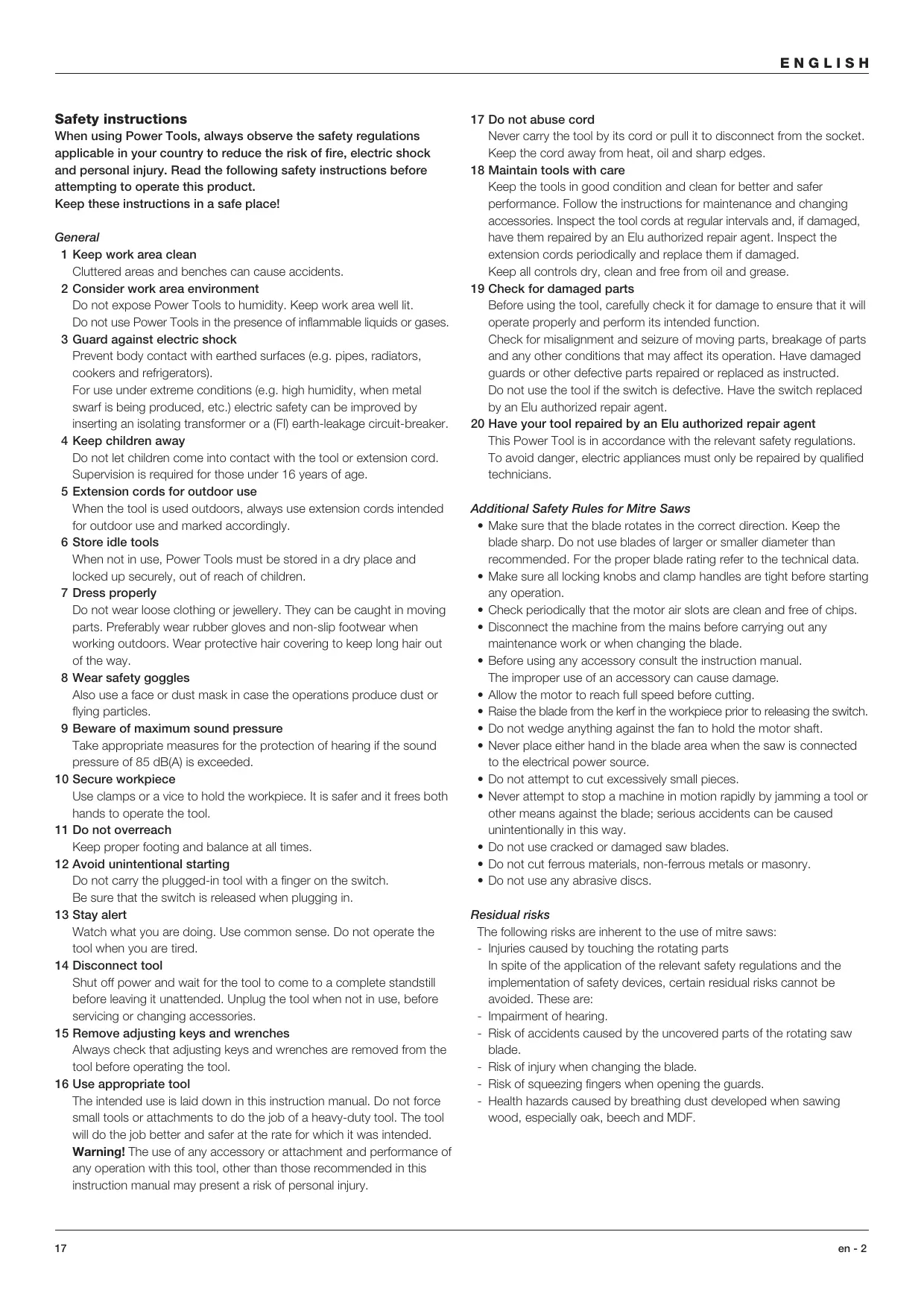 en - 6 ENGLISH Cutting non-ferrous metals When cutting non-ferrous metals, the machine is only to be used to perform vertical straight and mitre cross-cuts in the mitre saw mode. We recommend that bevel and compound mitre cuts should not be performed in non-ferrous metals. The machine is not to be used for cutting ferrous metals. Elu After-Sales service All Elu products are thoroughly tested before leaving the factory. However, if the product needs repair, please contact your dealer or the Elu Head Office for the address of the nearest Elu authorized repair agent (please refer to the back of this manual). GUARANTEE