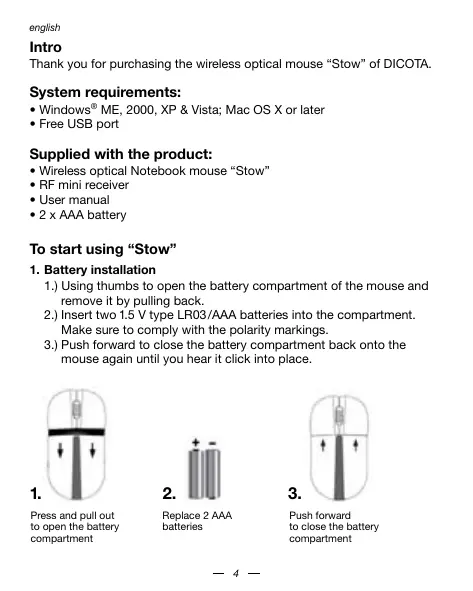 Thank you for purchasing the wireless optical mouse "Stow" of DICOTA.
