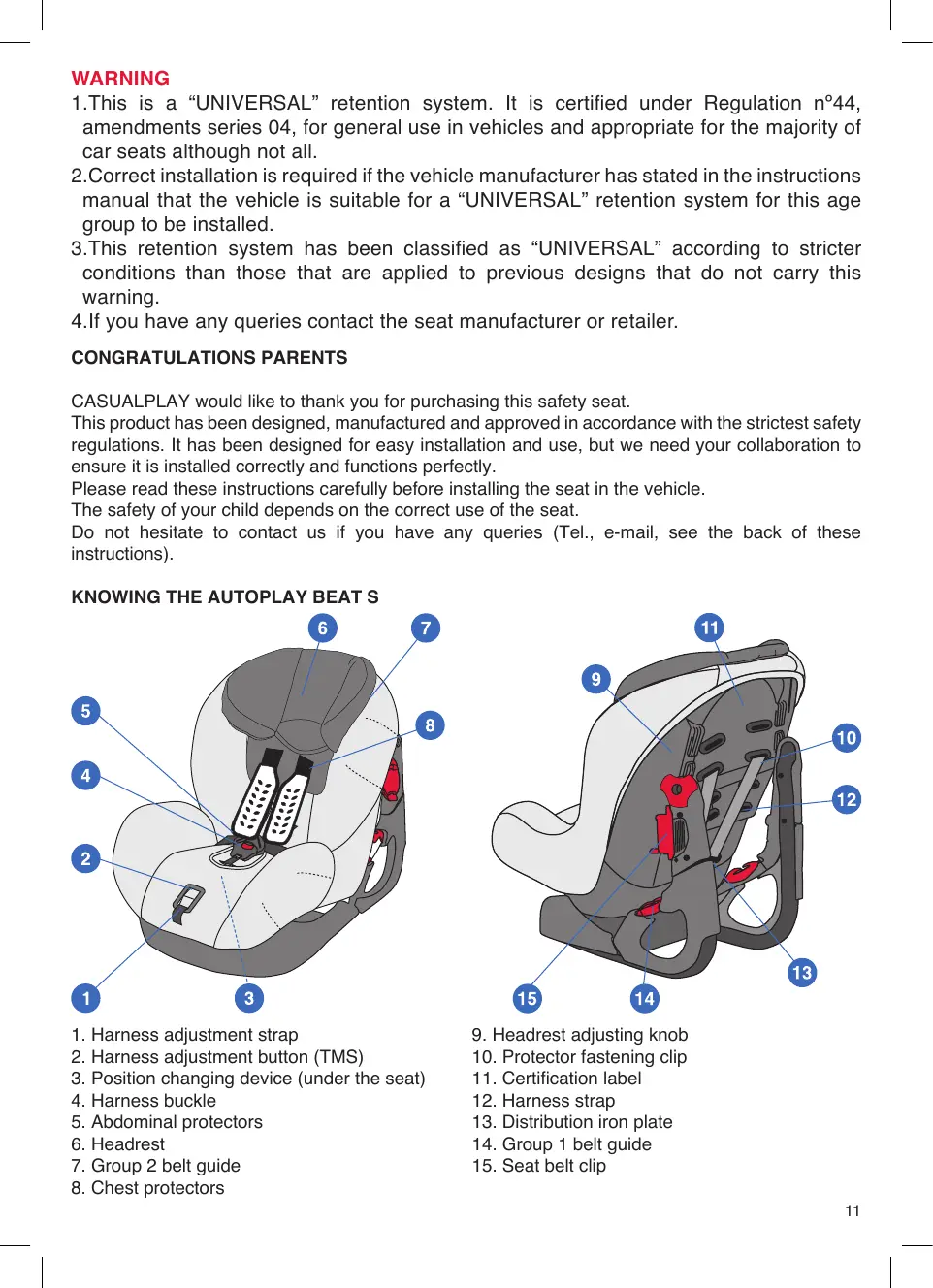 WARNING 1.This is a “UNIVERSAL” retention system. It is certified under Regulation nº44, amendments series 04, for general use in vehicles and appropriate for the majority of car seats although not all. 2.Correct installation is required if the vehicle manufacturer has stated in the instructions manual that the vehicle is suitable for a “UNIVERSAL” retention system for this age group to be installed. 3.This retention system has been classified as “UNIVERSAL” according to stricter conditions than those that are applied to previous designs that do not carry this warning. 4.If you have any queries contact the seat manufacturer or retailer. CONGRATULATIONS PARENTS CASUALPLAY would like to thank you for purchasing this safety seat. This product has been designed, manufactured and approved in accordance with the strictest safety regulations. It has been designed for easy installation and use, but we need your collaboration to ensure it is installed correctly and functions perfectly. Please read these instructions carefully before installing the seat in the vehicle. The safety of your child depends on the correct use of the seat. Do not hesitate to contact us if you have any queries (Tel., e-mail, see the back of these instructions).