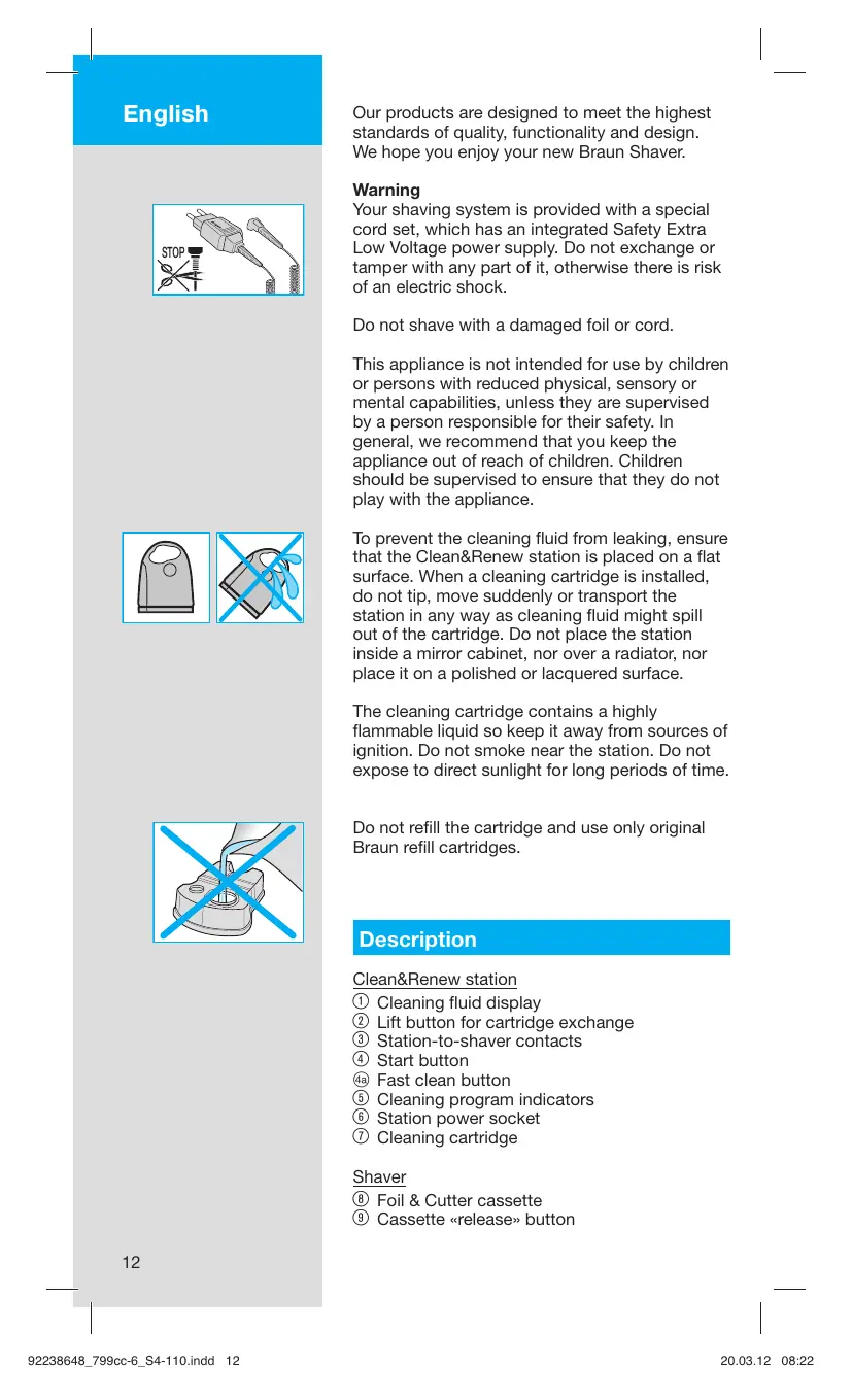 English STOP Our products are designed to meet the highest standards of quality, functionality and design. We hope you enjoy your new Braun Shaver. Warning Your shaving system is provided with a special cord set, which has an integrated Safety Extra Low Voltage power supply. Do not exchange or tamper with any part of it, otherwise there is risk of an electric shock. Do not shave with a damaged foil or cord. This appliance is not intended for use by children or persons with reduced physical, sensory or mental capabilities, unless they are supervised by a person responsible for their safety. In general, we recommend that you keep the appliance out of reach of children. Children should be supervised to ensure that they do not play with the appliance. To prevent the cleaning fluid from leaking, ensure that the Clean&Renew station is placed on a flat surface. When a cleaning cartridge is installed, do not tip, move suddenly or transport the station in any way as cleaning fluid might spill out of the cartridge. Do not place the station inside a mirror cabinet, nor over a radiator, nor place it on a polished or lacquered surface. The cleaning cartridge contains a highly flammable liquid so keep it away from sources of ignition. Do not smoke near the station. Do not expose to direct sunlight for long periods of time. Do not refill the cartridge and use only original Braun refill cartridges. Description Clean&Renew station 1 Cleaning fluid display 2 Lift button for cartridge exchange 3 Station-to-shaver contacts 4 Start button D Fast clean button 5 Cleaning program indicators 6 Station power socket 7 Cleaning cartridge Shaver Foil & Cutter cassette Cassette «release» button