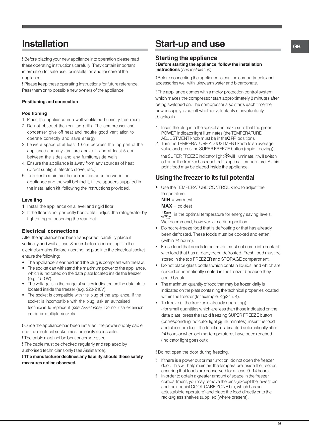 ! Before starting the appliance, follow the installation instructions (see Installation). ! Before connecting the appliance, clean the compartments and accessories well with lukewarm water and bicarbonate. ! The appliance comes with a motor protection control system which makes the compressor start approximately 8 minutes after being switched on. The compressor also starts each time the power supply is cut off whether voluntarily or involuntarily (blackout). 1. Insert the plug into the socket and make sure that the green POWER indicator light illuminates (the TEMPERATURE ADJUSTMENT knob must be in theOFF position). 2. Turn the TEMPERATURE ADJUSTMENT knob to an average value and press the SUPER FREEZE button (rapid freezing): the SUPER FREEZE indicator light will illuminate. It will switch off once the freezer has reached its optimal temperature. At this point food may be placed inside the appliance.
