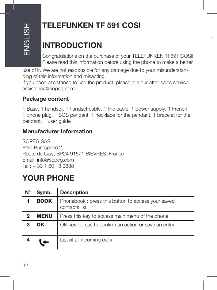 INTRODUCTION Congratulations on the purchase of your TELEFUNKEN TF591 COSI! Please read this information before using the phone to make a better use of it. We are not responsible for any damage due to your misunderstanding of this information and misacting. If you need assistance to use the product, please join our after-sales service: assistance@sopeg.com Package content 1 Base, 1 handset, 1 handset cable, 1 line cable, 1 power supply, 1 French T phone plug, 1 SOS pendant, 1 necklace for the pendant, 1 bracelet for the pendant, 1 user guide Phonebook : press this button to access your saved contacts list
