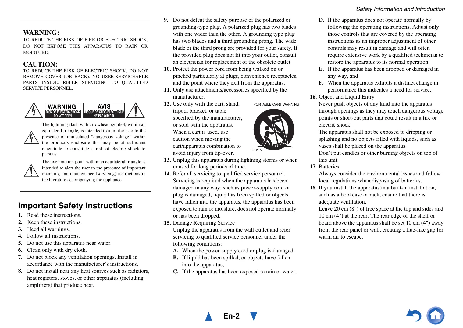 tripod, bracket, or table specified by the manufacturer, or sold with the apparatus. When a cart is used, use caution when moving the cart/apparatus combination to avoid injury from tip-over. Unplug this apparatus during lightning storms or when unused for long periods of time. Refer all servicing to qualified service personnel. Servicing is required when the apparatus has been damaged in any way, such as power-supply cord or plug is damaged, liquid has been spilled or objects have fallen into the apparatus, the apparatus has been exposed to rain or moisture, does not operate normally, or has been dropped. Damage Requiring Service Unplug the apparatus from the wall outlet and refer servicing to qualified service personnel under the following conditions: A. When the power-supply cord or plug is damaged, B. If liquid has been spilled, or objects have fallen into the apparatus, C. If the apparatus has been exposed to rain or water, sa25A À En2 Y